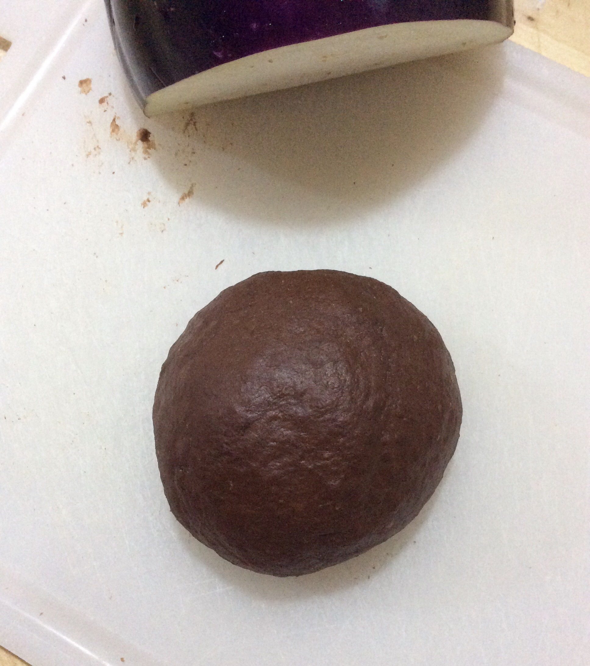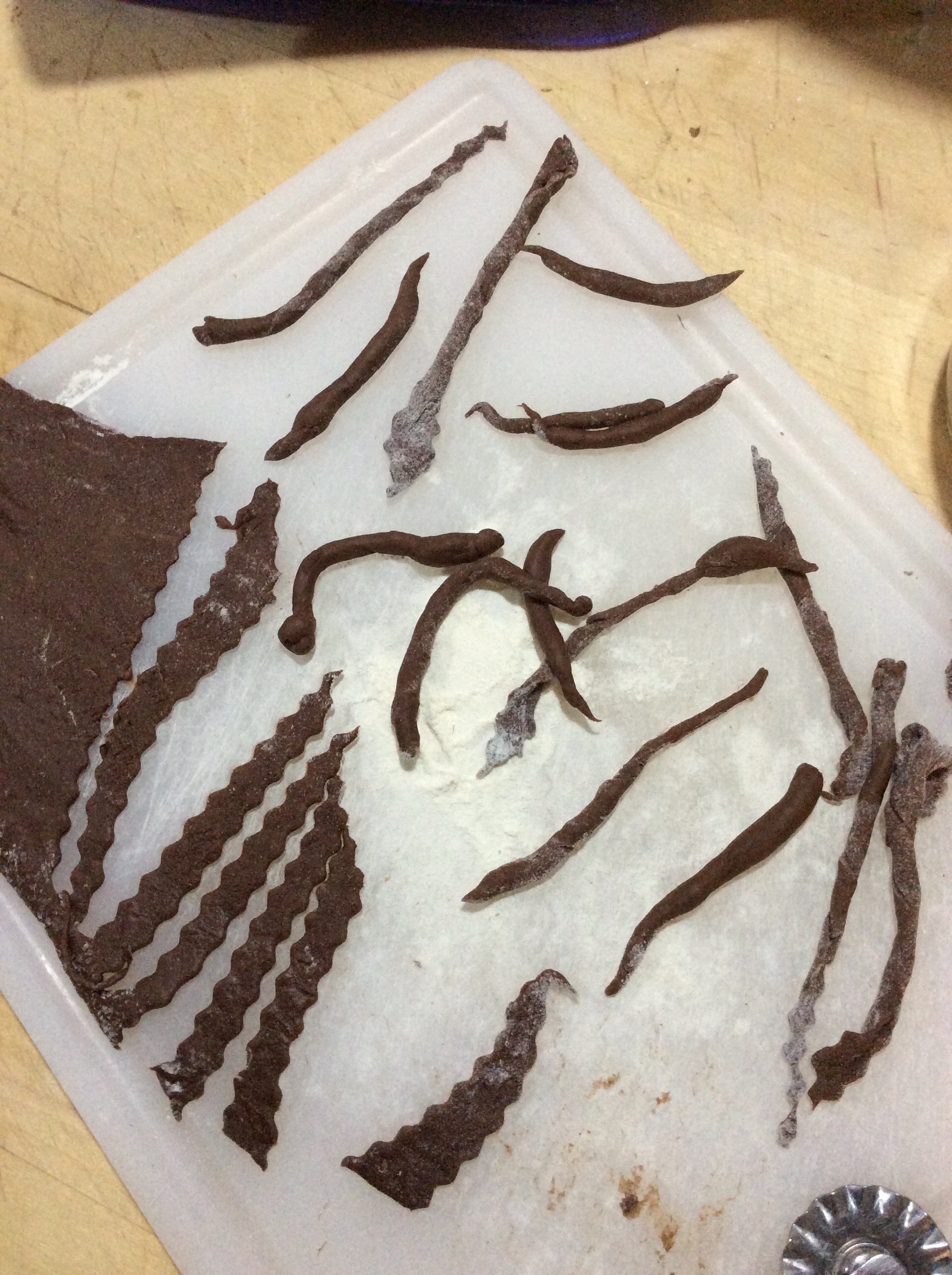 Impastiamo tre uova con tre cucchiai di cacao amaro setacciato, le fave tostate di cacao a piacere, uniamo farina 0 quanta ne prende per ottenere il solito impasto della pasta.