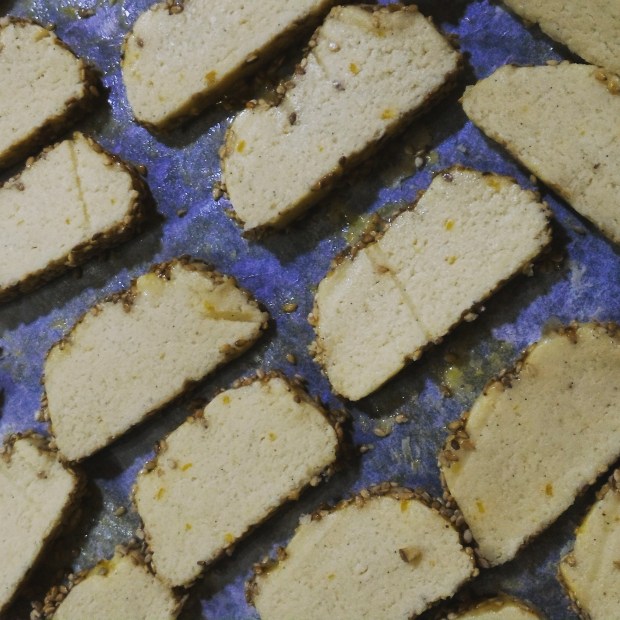 Riprendiamo il salame e spennellemiamo con il terzo tuorlo tutta la superficie. Facciamolo poi rotolare sul restante zucchero di canna e sui semi di sesamo ricoprendolo bene. Ora tagliamo dal rotolo tante fette di circa mezzo centimetro che sistemeremo sulla placca del forno precedentemente oleata e coperta da carta forno. Riscaldare il forno a 200 gradi e facciamo cuocere i biscotti per quasi un quarto d’ora. Togliamoli dal forno, facciamoli raffreddare per bene e sistemiamoli in un vassoio.
