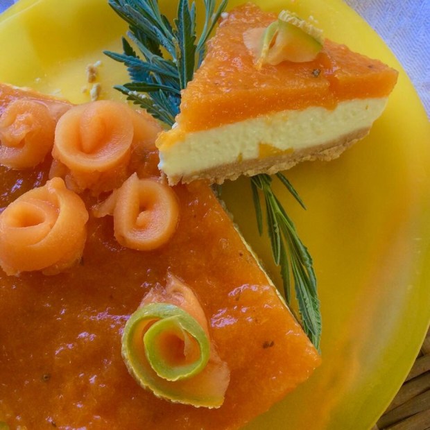Per la base: frullare i biscotti con il burro morbido unendo lo sciroppo di lavanda mescolare e compattare per ottenere una basa consistente e stenderla su pellicola in uno stampo apribile. Far gelare il tutto.