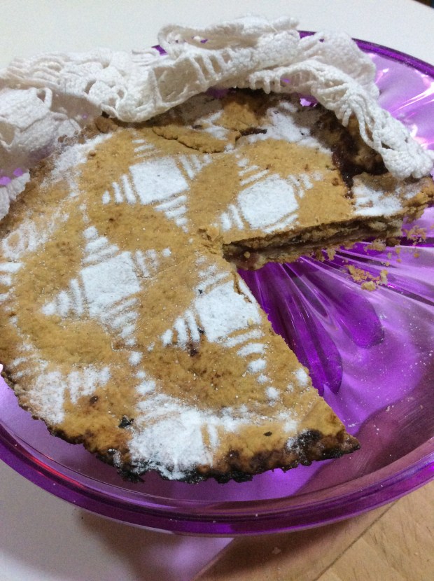 Mi è piaciuto usare il centrino all’uncinetto fatto quando ero una ragazza, per decorare una crostata con una frolla molto buona che sembra una pasta sfoglia di quella che si usa per preparare i famosi diplomatici. C’è il burro ma poco, ma il suo sapore è inconfondibile ed unico.