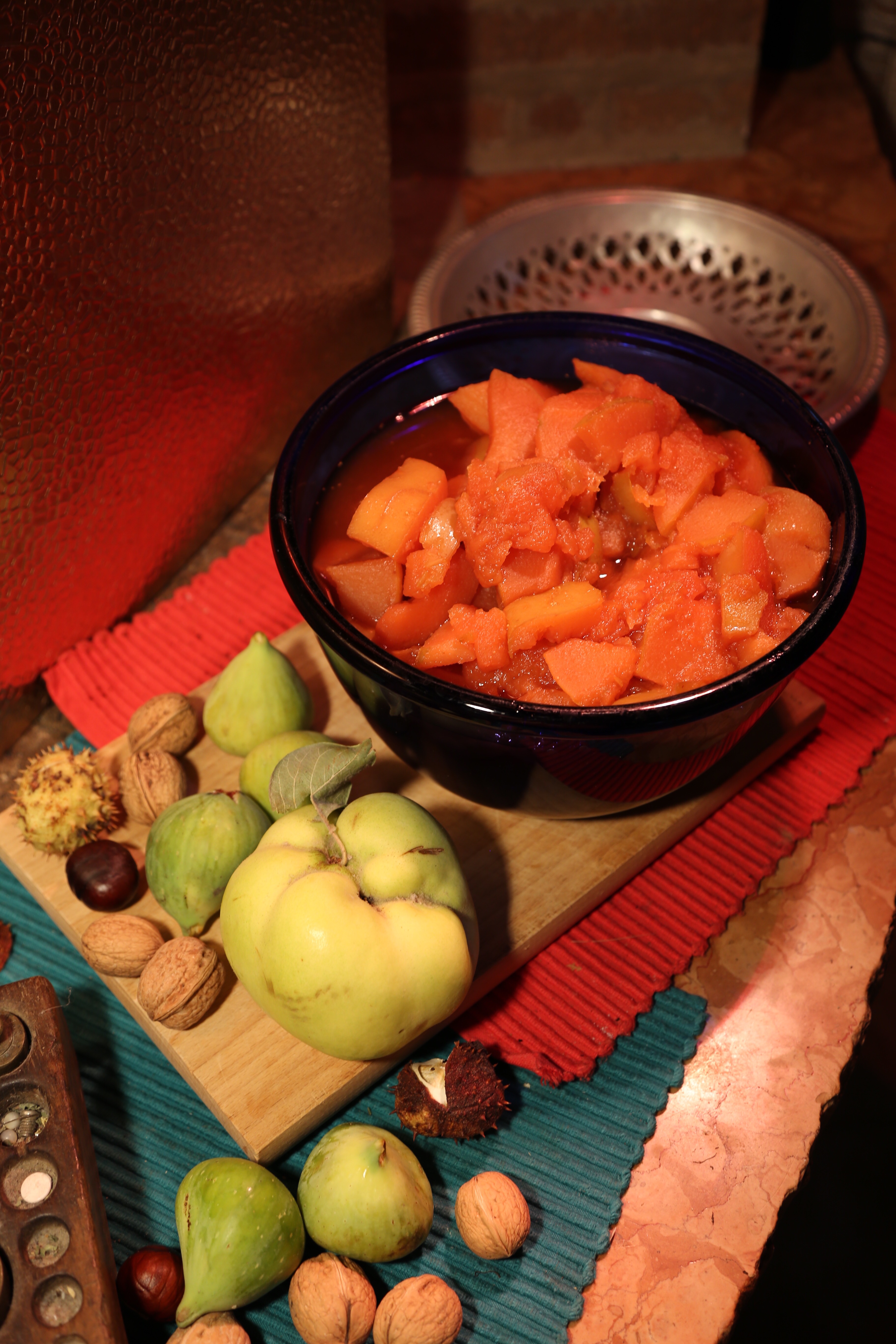 La mostarda è una marmellata di frutta cotta nel mosto fresco. Non è per niente come la classica piccante per l’aggiunta di senape. Prende il nome di mostarda per il semplice fatto che la frutta viene cotta nel mosto d’uva fresco. È una ricetta antica contadina che forse pochi ricordano o conoscono. È veramente una delizia per il palato per il suo soave sapore ed il profumo di rose. È buona solamente col pane ma rende i formaggi freschi che stagionati ancora più appetibili. Messa nel ripieno dei saccottini o crostatine è una prelibatezza. Per la cottura della marmellata aggiungere acqua invece del mosto d’uva fresco.