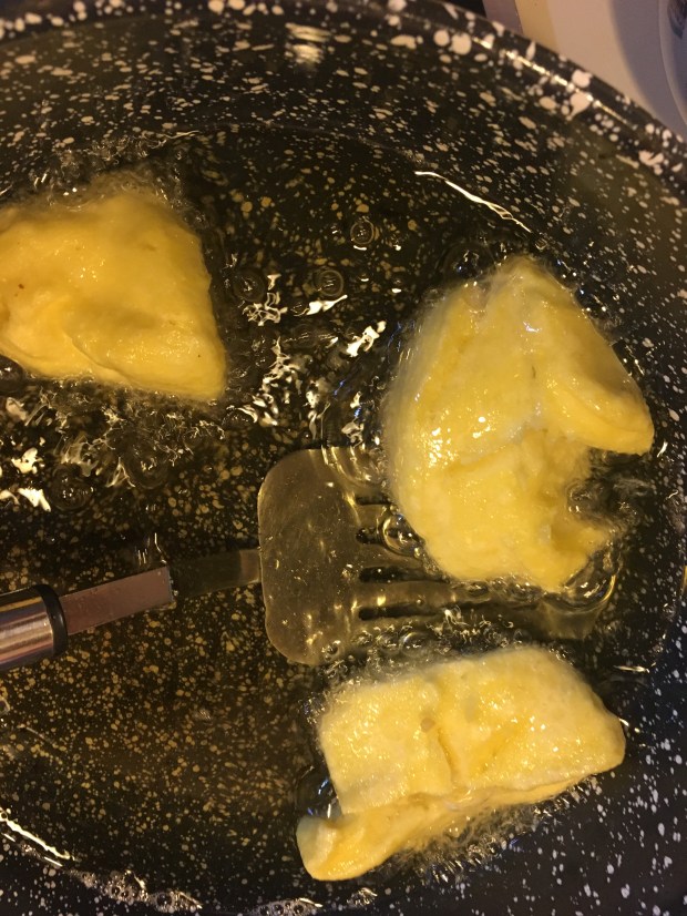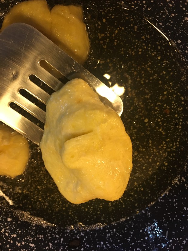 Ora mettiamo la padella dei fritti sul fuoco con un litro più o meno di olio di arachidi, appena è bello caldo uniamo tre scroccafusi non di più, facciamo riprendere il calore, e abbassiamo la temperatura perché devono cuocere piano piano fino l’interno della pasta.