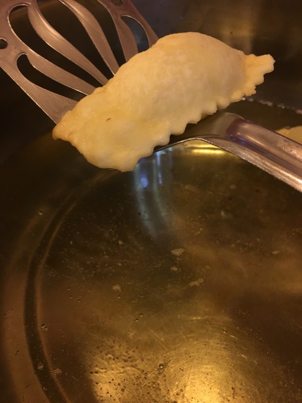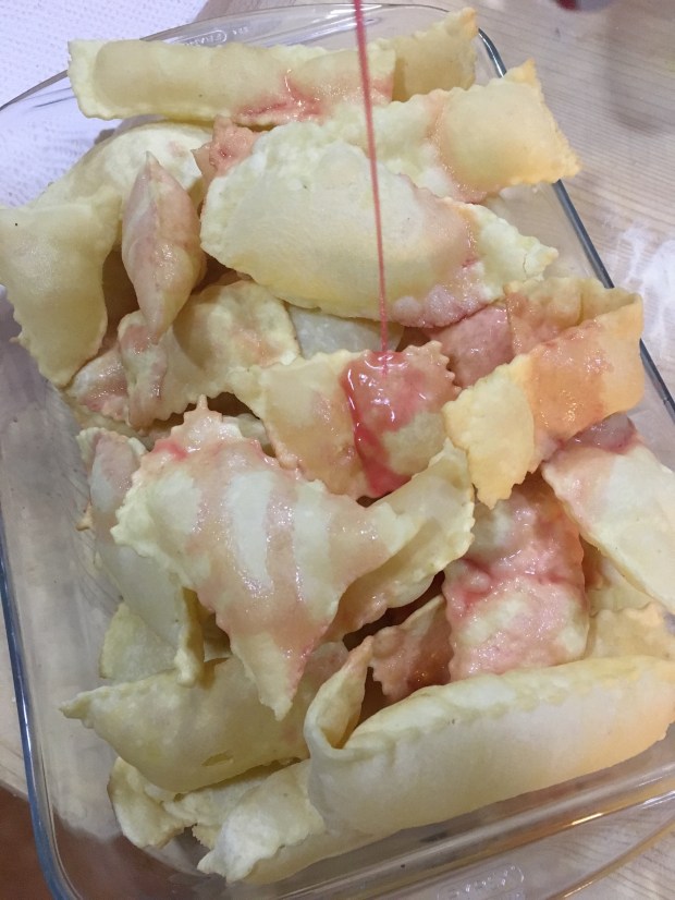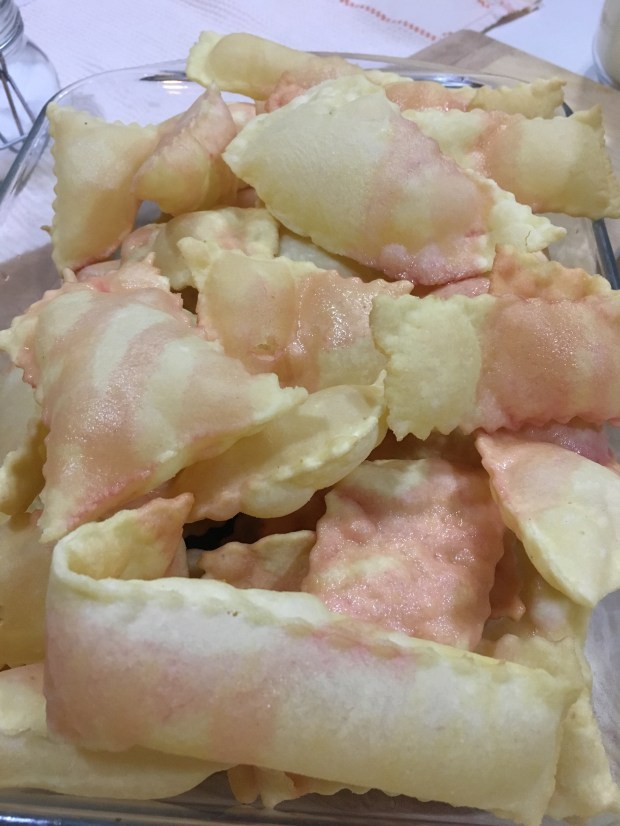 Riprendiamo la pasta e la stendiamo con la macchina della pasta con la seconda tacca. La tagliamo con la rotella a rombi o a strisce e friggiamo in olio di girasole alto oleico o nello strutto. Lasciamo cadere sopra un filo di alchermes e spolveriamo di zucchero!