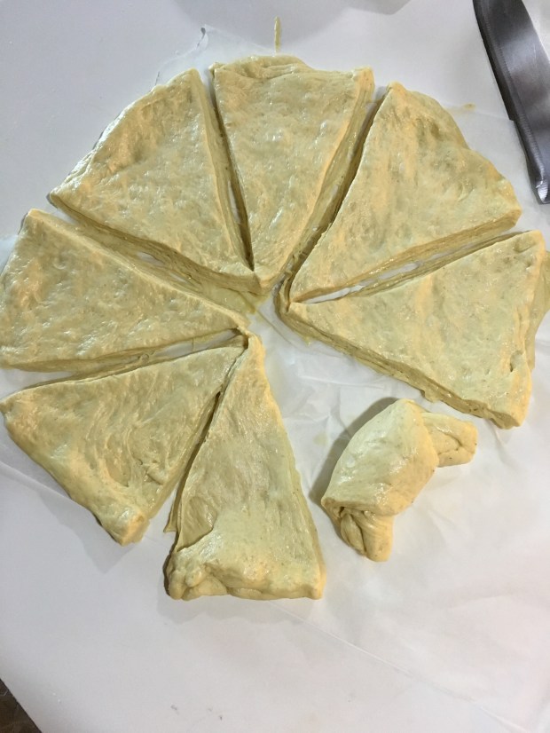 Riprendiamo la pasta, lavoriamo la pasta sopra la spianatoia per sgonfiarla e lasciamo che raddoppi per la seconda volta e la copriamo con la ciotola. Al raddoppio, dividiamo la pasta in sei palline dello stesso peso, sui 200 gr più o meno, le stendiamo come una piadina ad una ad una, ungiamo ognuna con un velo di olio extravergine di oliva e le sovrapponiamo tutte e sei. Passiamo sopra il mattarello per formare un cerchio che dividiamo in sei triangoli. Chiudiamo ognuno come un croissant e sistemiamoli dentro uno stampo da plum-cake unto e infarinato. Mettiamo a lievitare per l’ultima volta fino a quando la pasta supera il bordo dello stampo. Spennelliamo la superficie con un po’ di olio ed acqua.