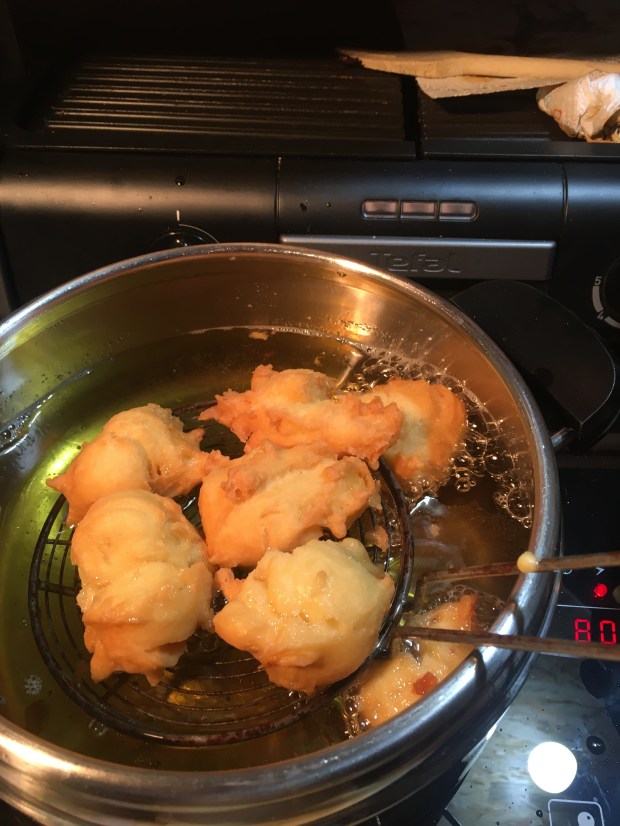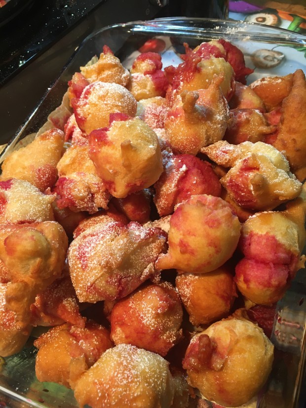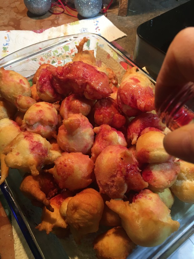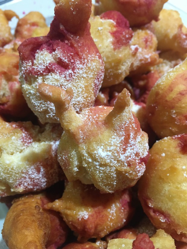 Pranzo, riposo e voglia di castagnole. Non ci vuole molto tempo, si mescolano uova stavolta erano di galline felici, beate loro, farina, olio, un “acino”di zucchero come dicevano le nostre mamme, lievito ed il nostro mistrà Varnelli ed eccole tuffate in olio profondo le castagnole più buone del mondo! Sono buonissime, molto simili agli scroccafusi per i quali ci vogliono tempo, pazienza e un pizzico di mistero! Perché per farli c’è un rito particolare! Parola di Peppa!