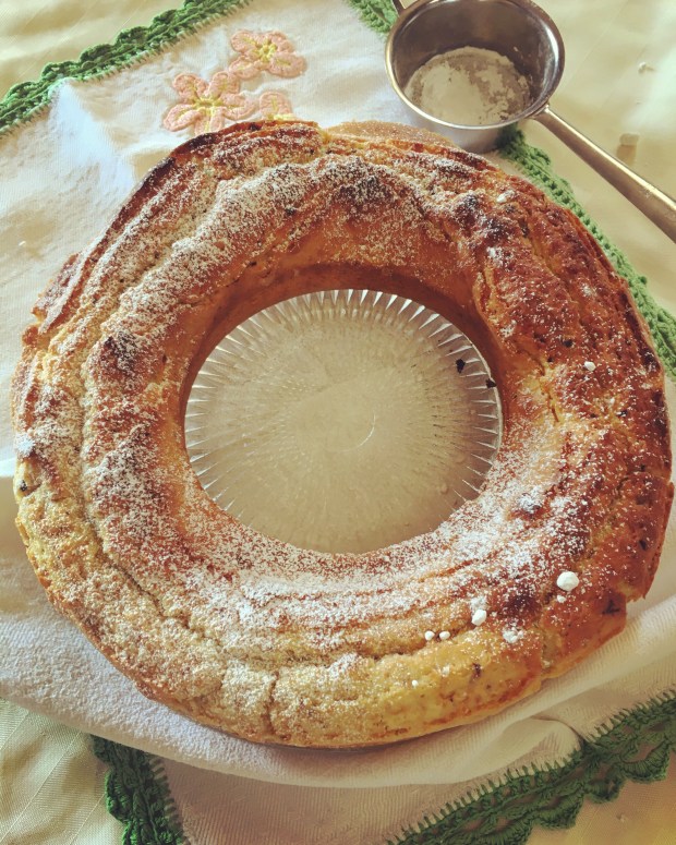 A fare da sfondo una tovaglietta di panno in lino del corredo di casa, con applicazioni all’ uncinetto fatte quando ero una giovane fidanzata e preparavo la mia “cassa” da sposa prossima. Sopra, il ciambellone del nonno, con la pretesa di essere come quello che piaceva molto ai miei ex bimbi i quali a turno, mandavo a comprare da Renata. Non ho mai saputo quale sia stato il segreto per far sì che il mio ciambellone del nonno, avesse lo spesso sapore di quello comprato alla pizzicheria quattro passi più in là del nostro negozio di abbigliamento. Forse non lo scoprirò mai, se qualcuno me lo svelasse ne sarei contenta. Intanto io l’ho fatto così. Ho montato tre uova di galline felici con 150 grammi di zucchero, molti montano prima gli albumi e uniscono i rossi, ma per me non cambia un granché, ho unito 120 grammi di latte, 120 grammi di olio di girasole, 225 grammi di farina e 220 grammi di di fecola, una bustina di lievito per dolci un po’ di buccia di limone, ho mescolato ed ho aggiunto aroma di mandorle e pezzetti di cioccolato fondente infarinati. Ho versato nello stampo unto di burro e di pezzetti di mandorle ed ho cotto a 180 gradi per 40/45 minuti coprendo con un foglio di alluminio a metà cottura. È buono lo stesso il mio ciambellone del nonno, ma per il primo genito non è come quello comprato da bambino! Ricordo, nostalgia e malinconica insieme? Può darsi! Lo scoprirò il segreto? O sarà mantenuto segretamente da chi lo conosce?