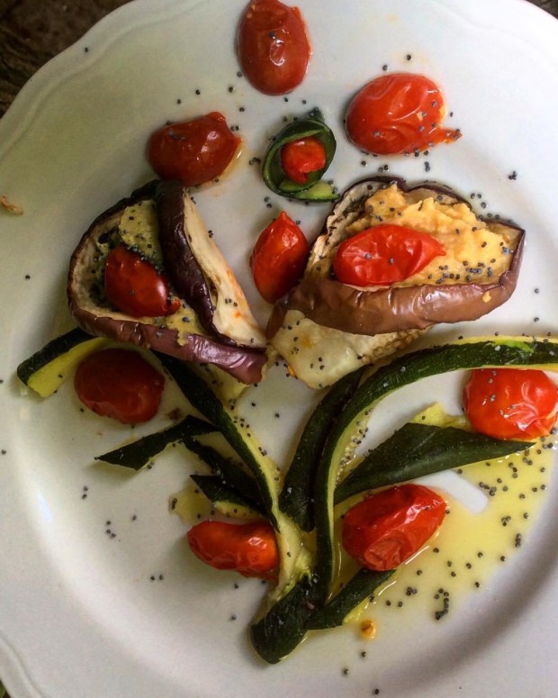 Un barattolo di ceci, scolati e sciacquati bene e frullati con olio extravergine di oliva di casa nostra, curcuma e pepe nero, una zucchina, una melanzana cotta a microonde, basta mettere le verdure tagliate a fettine in un piatto coperto con un altro e farli cuocere leggermente oppure nel piatto crisp per ottenere verdure più croccanti, pomodorini confit già preparati l’altro giorno e conservati sott’olio, semi di papavero e di sesamo!