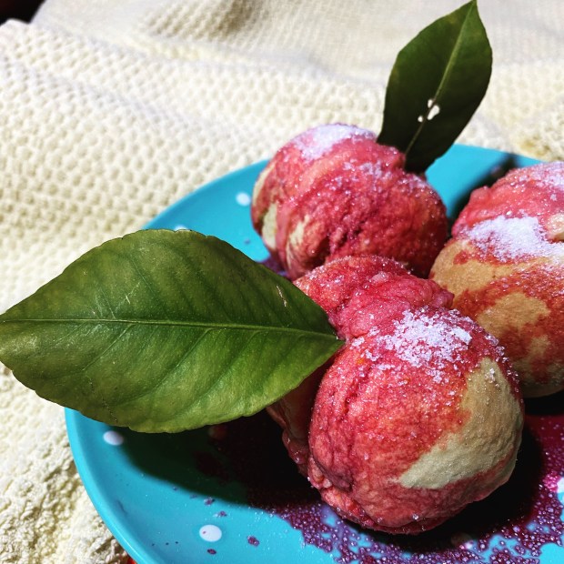 Erano gli anni del boom economico, a Petriolo come in ogni dove, si stava da Dio. Le feste erano tutte rispettate e mai rimandate a data da destinare, a nessuno veniva in mente una fesseria del genere. Dopo il Natale, seguiva subito il periodo carnevalesco, si ballava a turno in ogni casa tutte le domeniche con lo stereo a tutto volume e le canzoni di Mina, di Elvis Presley e tutto il campionario di cantanti di quel tempo. Il giovedì grasso si cambiava scena, non era più nelle nostre case la festa, ma nelle case di campagna di amici dove dopo cena, al suono dell’organetto e di saltarello veniva offerta una grande varietà di dolci di carnevale sui “cavarè”, i vassoi lucidi simil acciaio che erano venuti di moda. C’erano i dolci più tradizionali delle nostre parti, “ li scroccafùsi e le pesche dóce”, più grandi di una testa di un neonato comprati al forno del paese quello che stava su per la via della pace. Noi quelle pesche dolci così grandi non le facciamo quasi mai, quelle erano fatte come tradizione voleva, con il lievito di birra che poi si lasciavano lievitare. Per non dimenticare, ci consoliamo con le nostre peschette ripiene di crema pasticcera, colorate di alchermes e spolverate di zucchero. Ci stanno bene lo stesso, anche perché ci riportano indietro a pensare com’erano belli e spensierati quegli anni.