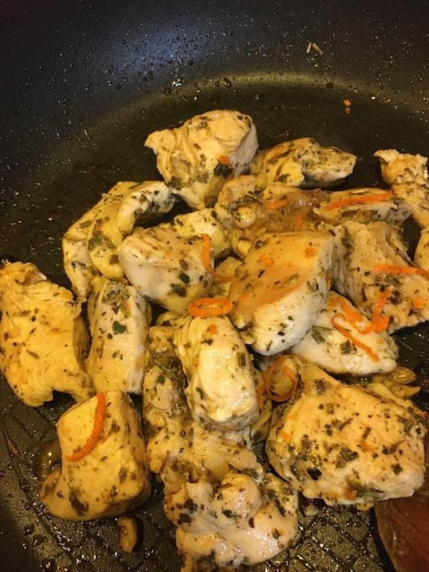 Tritiamo la buccia di arancia e mettiamola in una terrina con anche il liquore all’arancia, il tè nero, l’olio extravergine di oliva, il pollo a cubetti, il sale, le erbe aromatiche, timo, alloro, rosmarino, santoreggia ed erba cipollina. Lasciamo marinare per un po’ di tempo.