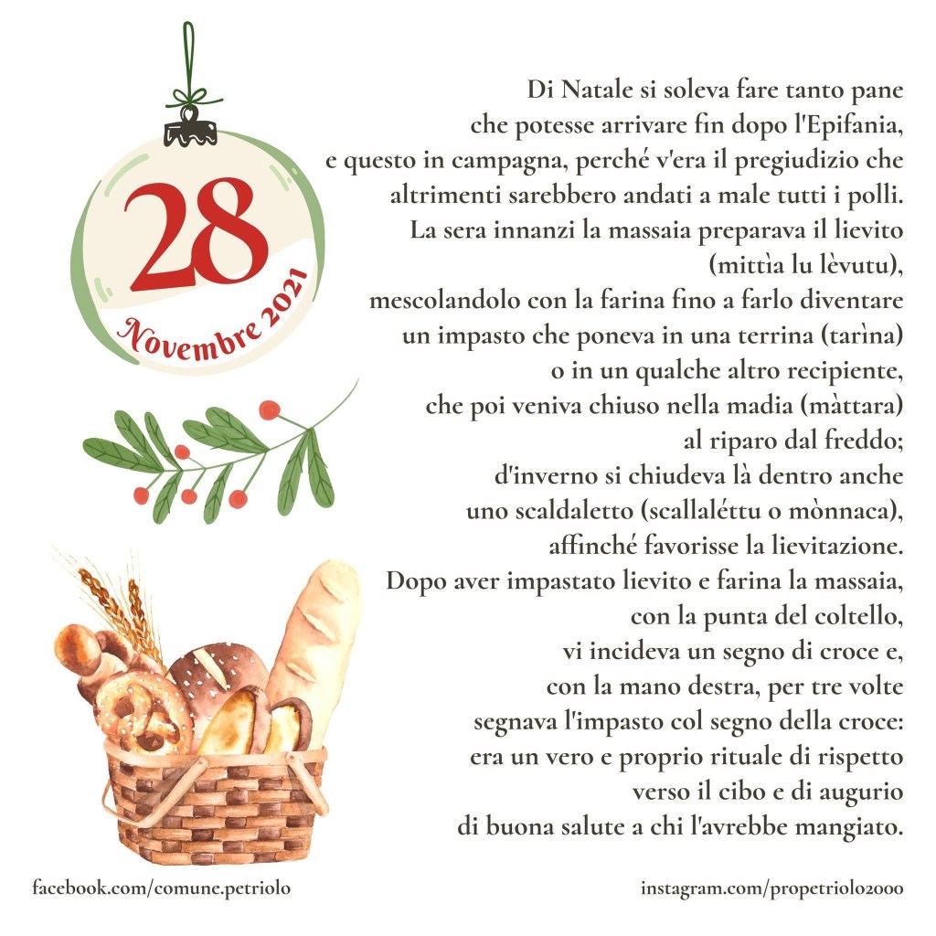 Di Natale si soleva fare tanto pane che potesse arrivare fin dopo l’Epifania, e questo in campagna, perchรฉ v’era il pregiudizio che altrimenti sarebbero andati a male tutti i polli. La sera innanzi la massaia preparava il lievito (mittรฌa lu lรจvutu), mescolandolo con la farina fino a farlo diventare un impasto che poneva in una terrina (tarรฌna) o in un qualche altro recipiente, che poi veniva chiuso nella madia (mร ttara) al riparo dal freddo; d’inverno si chiudeva lร dentro anche uno scaldaletto (scallalรฉttu o mรฒnnaca), affinchรฉ favorisse la lievitazione. Dopo aver impastato lievito e farina la massaia, con la punta del coltello, vi incideva un segno di croce e, con la mano destra, per tre volte segnava l’impasto col segno della croce: era un vero e proprio rituale di rispetto verso il cibo e di augurio di buona salute a chi l’avrebbe mangiato.