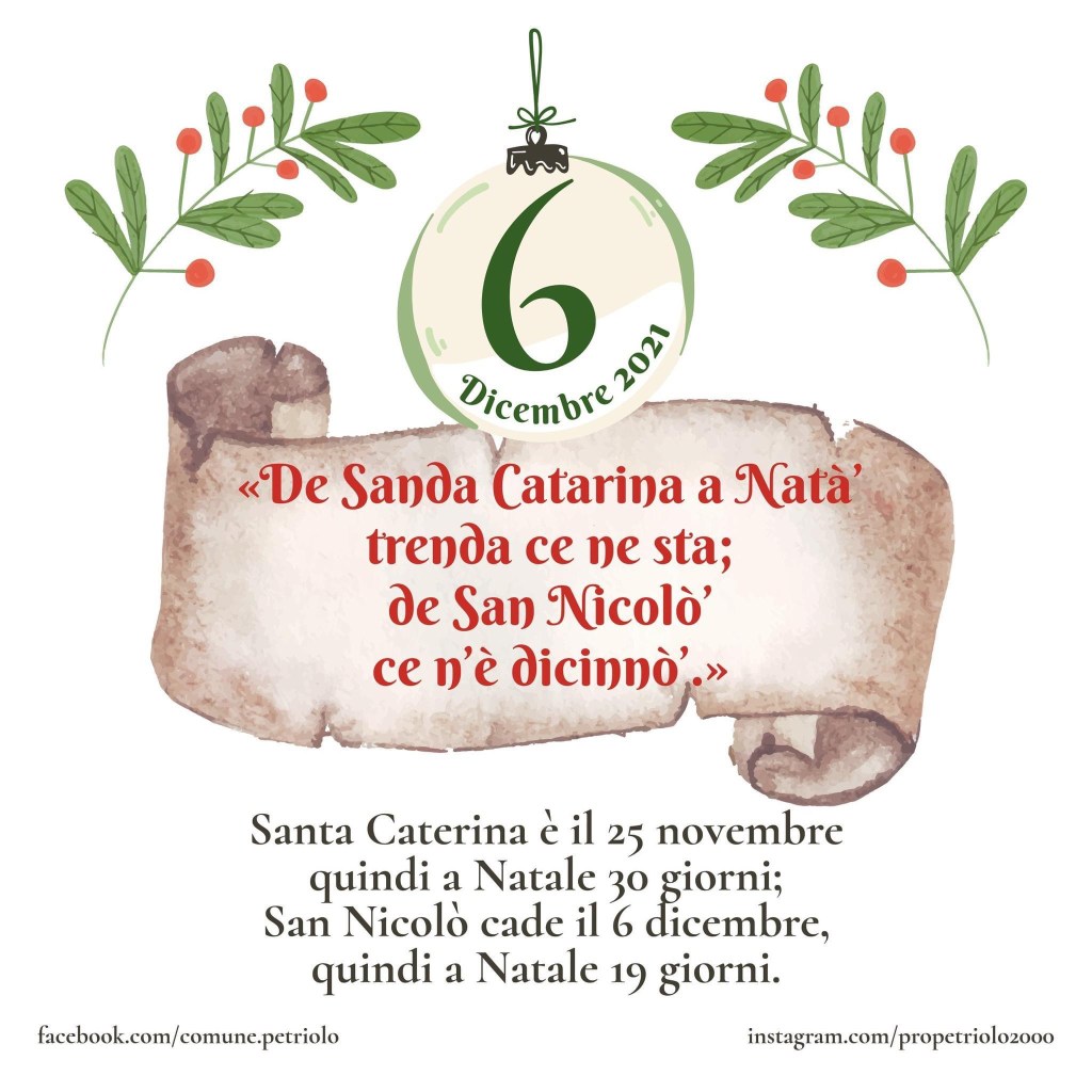Santa Caterina รจ il 25 novembre quindi a Natale 30 giorni; San Nicolรฒ cade il 6 dicembre, quindi a Natale 19 giorni.