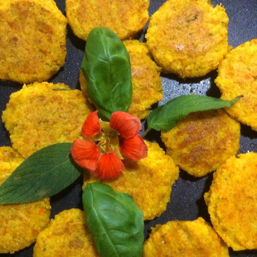 E allora? Mescolo la quinoa, le carote, la curcuma, la noce moscata, uno o più di uova, un fiore di nasturzio giallo, questo fiore commestibile ha un sapore aspro e piccante e dà corpo al sapore degli altri ingredienti dolciastri, timo, erba cipollina, maggiorana, olio extravergine d’oliva e un po’ del nostro pane naturale con semi! Lavoro con le mani e via, le polpette sono pronte! In forno a microonde per pochi minuti, ed al forno normale alla temperatura di 180 gradi per una ventina di minuti più o meno. Le polpette devono risultare croccanti.