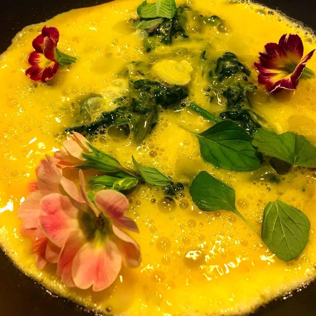 Primule, mentuccia, timo, erba cipollina, maggiorana, melissa, cicoria, bietole, limone e scamorza grattugiata sono gli ingredienti che abbiamo per fare la frittata con le uova di galline felici!