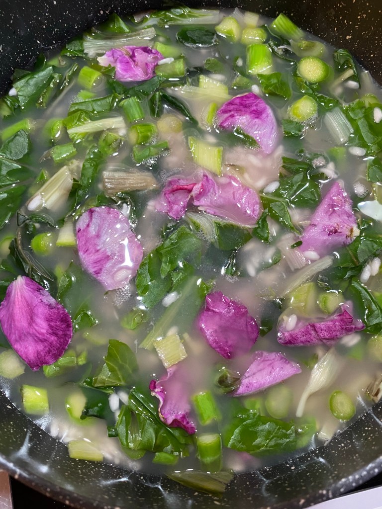 Arrivata l’ora del pranzo, prima sono andata a raccogliere le bietole, avevo gli asparagi, ho tagliato tutto in piccoli pezzi che ho lasciato cuocere nella pentola antiaderente per aggiungere anche il riso. Ho riscaldato il brodo di petali di rose, che è servito per finire di cuocere il risotto. Io normalmente condisco tutto a crudo per questione di difficile digestione, quindi alla fine ho aggiunto un filo di olio extravergine di oliva ed una noce di burro con una spolverata di parmigiano reggiano e decorato con i petali di rose!