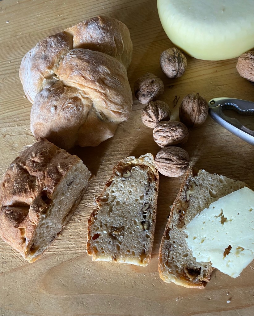 Noi abbiamo molta fantasia nel preparare il pane, certamente il principale è quello di tutti i giorni, semplice lievito madre, acqua farina e sale, poi a seconda delle stagioni possiamo unire spezie, erbe aromatiche e formaggi. Dipende dal momento.