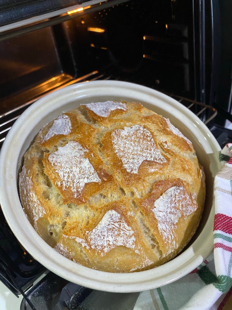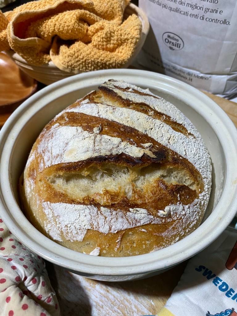 Questo pane potremmo cuocerlo nella pentola di coccio, la temperatura deve essere sempre a 230 gradi, diminuita dopo 10 minuti, per due volte sempre con il coperchio. Verso gli ultimi 5/7 minuti, lo togliamo dalla pentola e lo facciamo finire di cuocere ventilato con lo sportello a spiffero.