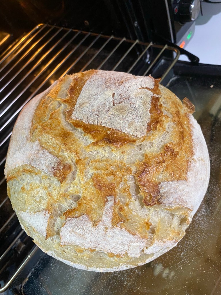 Accendiamo il forno a 230 gradi, alla temperatura raggiunta mettiamo a scaldare una lastra per alcuni minuti, la tiriamo fuori, la infariniamo leggermente e capovolgiamoci sopra il pane, spolveriamo la farina togliendo l’eccesso, facciamo un taglio a croce o per tutta la lunghezza e mettiamo in forno. Scaliamo la temperatura ogni 10 minuti, 230 / 210/ 200 / fino a 180/170 gradi, gli ultimi mettere la modalità ventilata lasciando lo sportello aperto a spiraglio con un cucchiaio di legno.