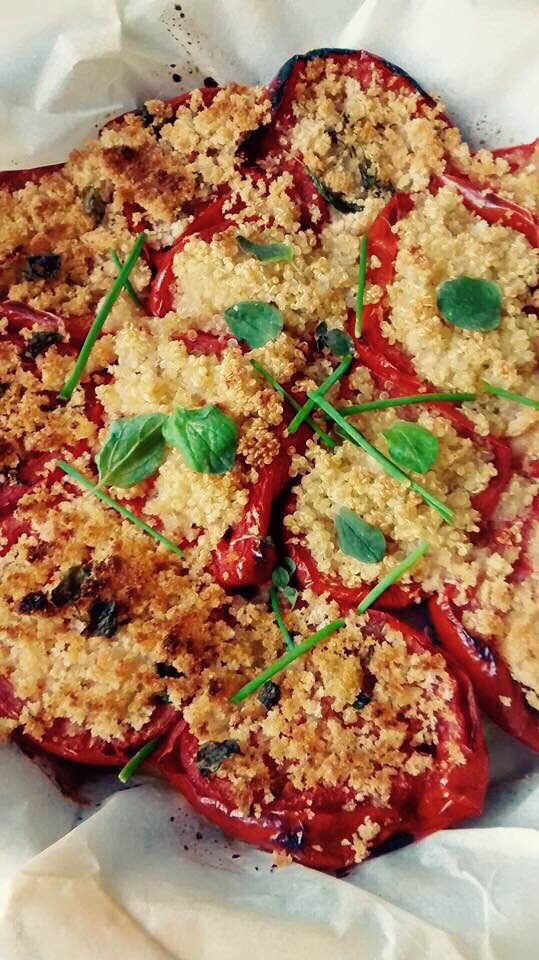 In una padella abbastanza larga, mettere un filo di olio e tostare la quinoa lavata per togliere la saponina ( gli esperti dicono che faccia male). Dopo qualche minuto, aggiungere il brodo vegetale o l’acqua salati, far cuocere per 15 minuti e sgranare con una forchetta. Unire la curcuma e l’olio extravergine d’oliva, il sesamo tostato e macinato, il parmigiano ( facoltativo), mescolare bene e riempire i pomodori tagliati in due salati leggermente.