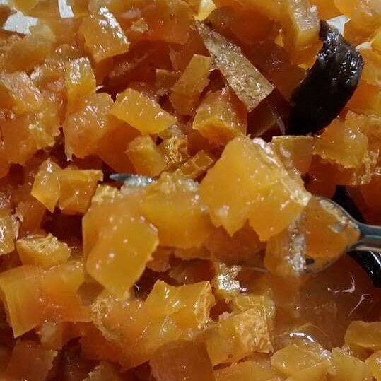 Ungiamo degli stampi a piacere, piccoli o grandi, cospargiamo di pane grattugiato e versiamo il composto del “crustingu”, in un’ altezza di quattro o cinque centimetri, livelliamo la superficie con le mani unte di olio e decoriamo con le mandorle e filetti di arancia.
