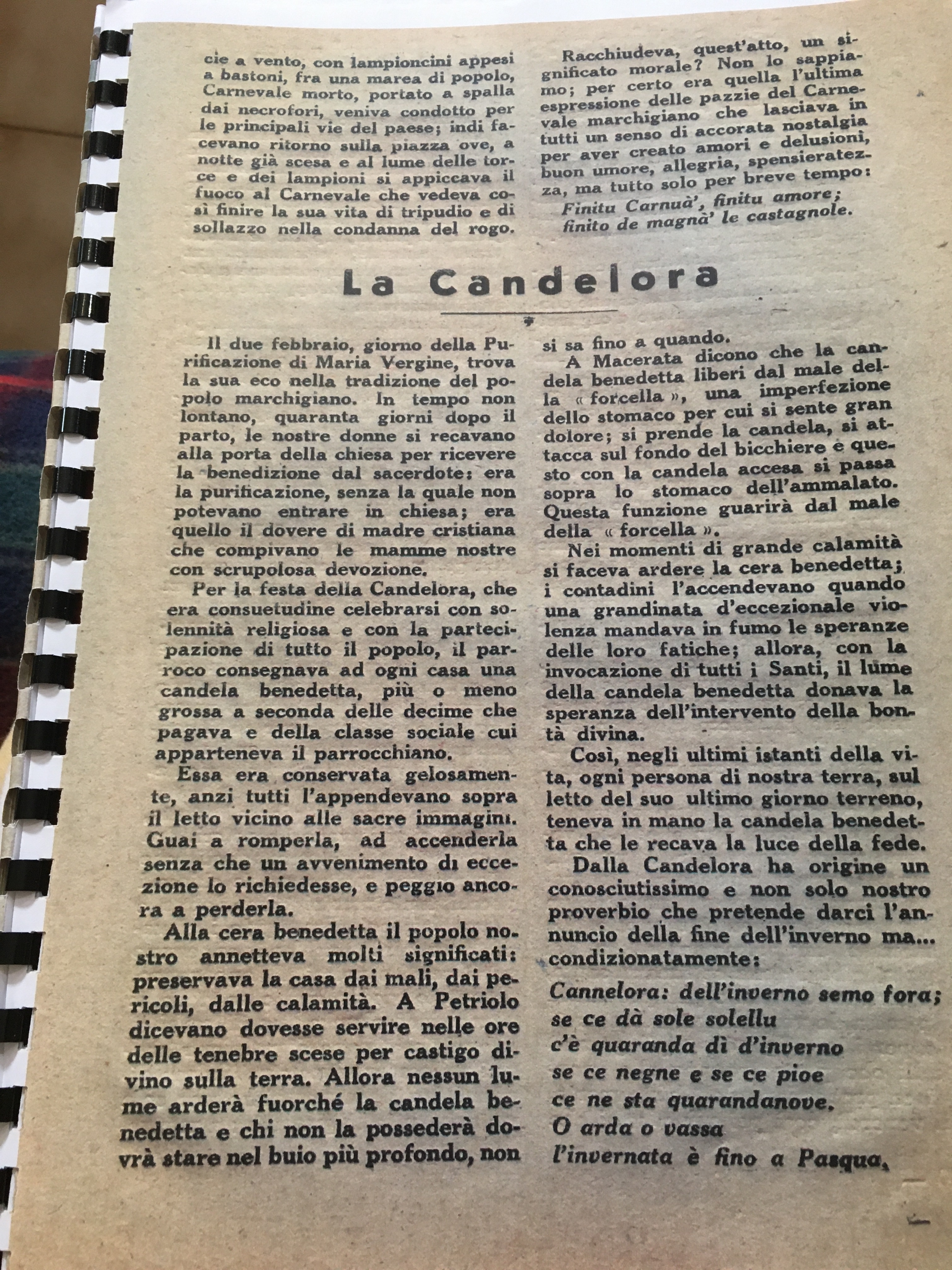 Nella celebrazione della messa della Purificazione di Maria Vergine, il parrocco dona ad ogni fedele una candela benedetta come segno di una Luce perennemente accesa per non perdere la fede. Una volta era più o meno grossa a seconda delle decime che pagava e della classe sociale cui apparteneva il parrocchiano. La candela portata a casa, era conservata gelosamente e veniva appesa sopra il letto insieme alle immagini sacre. Era un brutto segno se la candela si rompeva, o veniva accesa senza un’occasione eccezionale e peggio ancora perderla. La candela benedetta preservava le persone dai mali, le case dai dalle calamità e dai pericoli. Si diceva che servisse a far luce nelle tenebre scese per castigo divino sulla terra. Allora nessun lume arderà fuorché la candela benedetta e chi non la possederà dovrà stare al buio più profondo fino a non si sa quando. La candela benedetta si faceva ardere nelle grandi calamita naturali, i contadini l’accendevano quando una grandinata eccezionale stava per mandare in fumo le speranze delle loro fatiche, insieme alla preghiera delle litanie dei Santi, il lume della candela benedetta donava una speranza dell’intervento della bontà divina. Così negli ultimi istanti della vita, ogni persona di nostra terra, sul letto del suo ultimo giorno terreno, teneva in mano la candela benedetta che le recava la luce della fede.