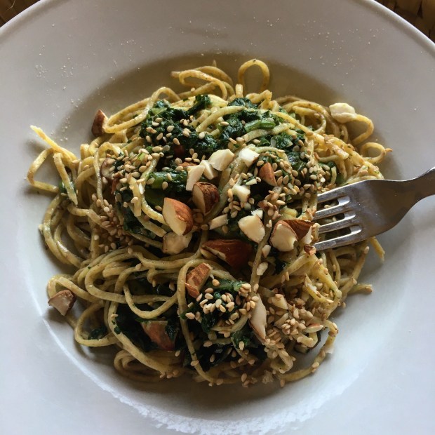 Tagliatelle integrali con cavoli neri mandorle e sesamo al profumo di melissa