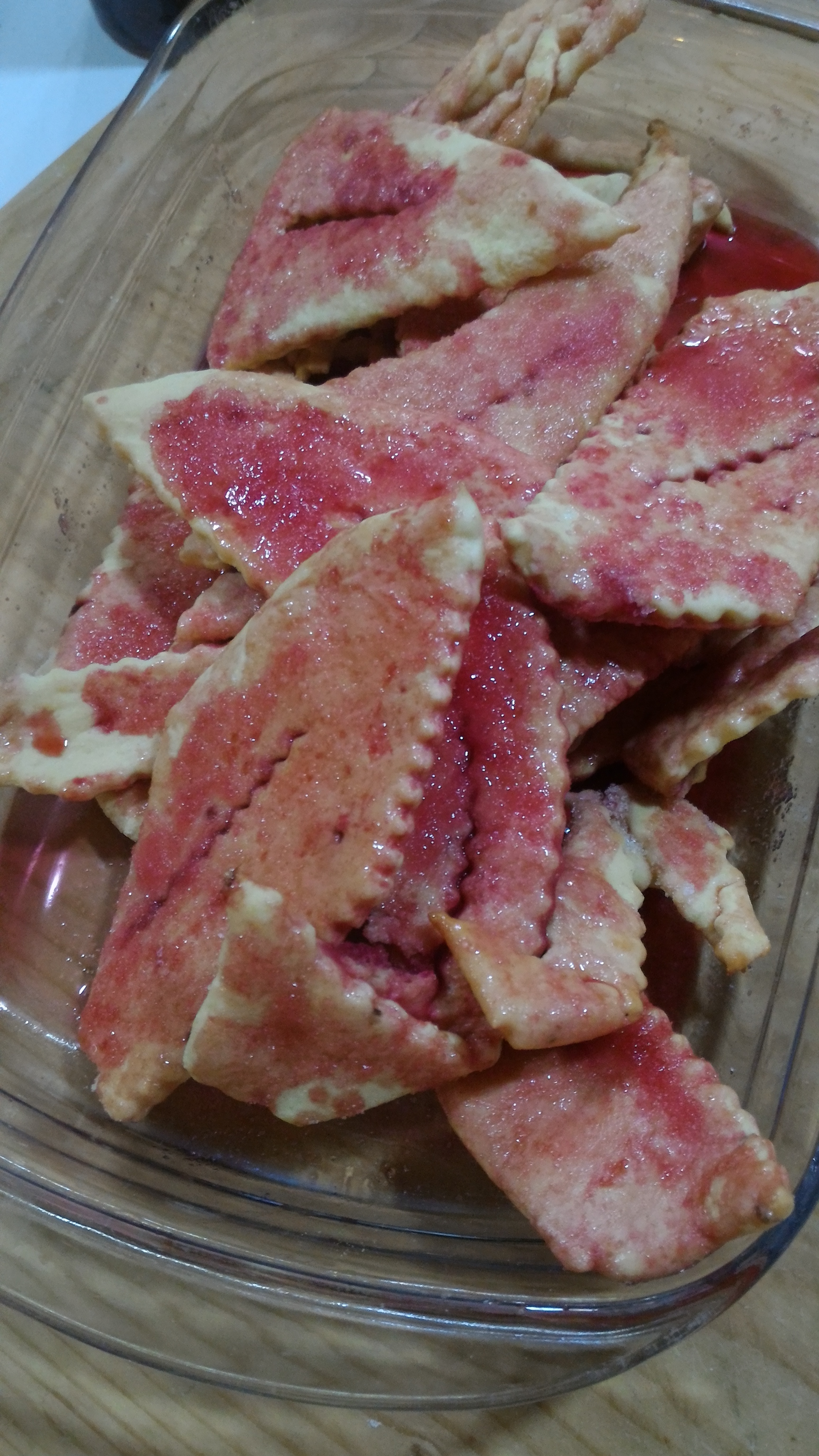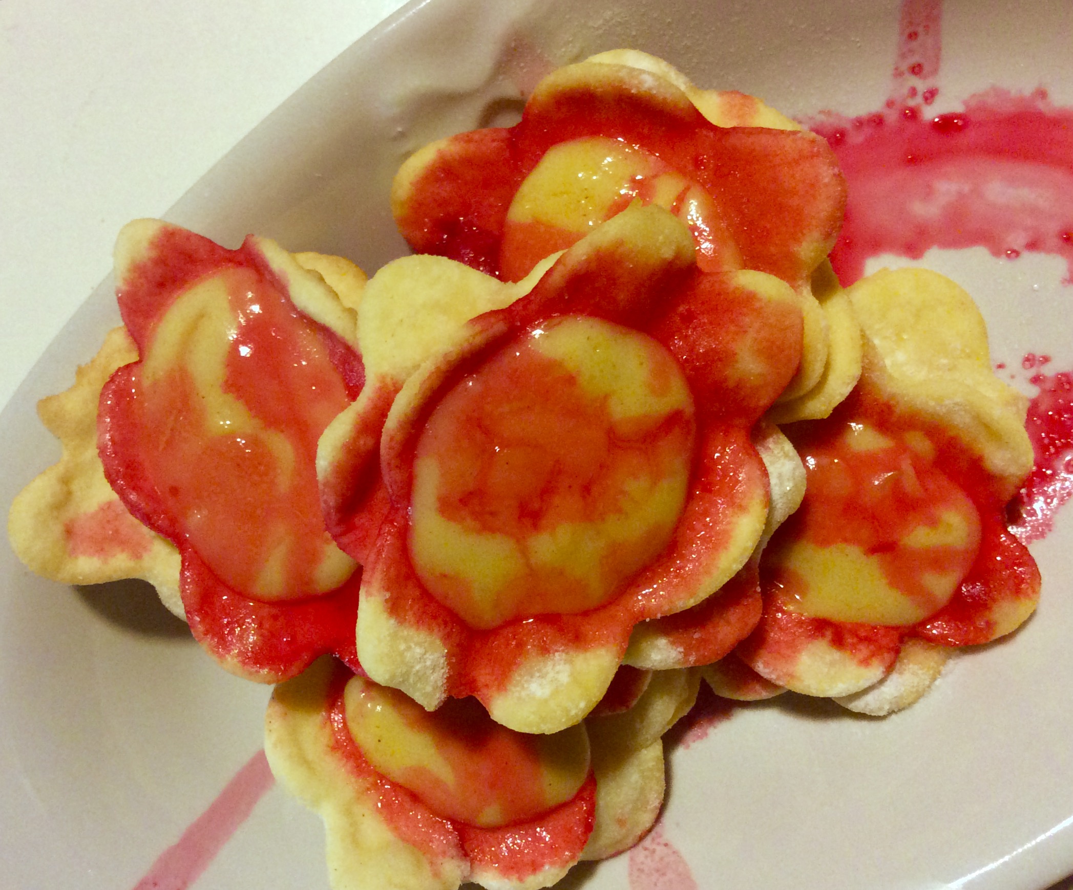 Variante con la crema pasticcera al limoncello. Basta fare il fiore, mettere in mezzo un po’ di crema e ricoprire con un altro fiore chiudendo bene i bordi. Cottura allo stesso modo. Prima di servirli, far cadere alcune gocce di alchermes e una spolverata di zucchero semolato.