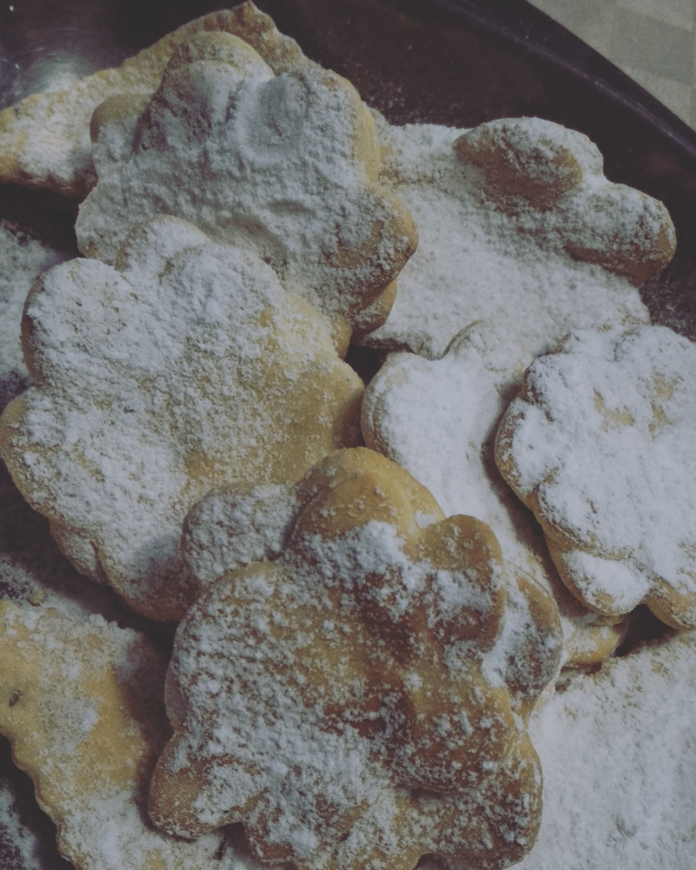 Friggere in una giornata d’inverno è un’impresa, l’odore si spande ovunque anche nei vestiti. Le finestre sono chiuse ed allora per evitare tutto questo, preferisco cuocere i dolci tipici di carnevale, al forno. Sono ottimi ed oltretutto non fanno male. Queste fiori di chiacchiere, hanno un solo cucchiaino di zucchero ed un cucchiaio di miele. Sono ottimi anche come biscotti salati, senza lo spolvero di zucchero a velo perché hanno una sapidità naturale. Ingredienti 400 gr di farina 00 4 uova 60 gr di burro Tre cucchiai di olioextravergineoliva Un cucchiaino di zucchero Un cucchiaio di miele Buccia di arancia o cannella Semi di anici o zenzero grattugiato Liquore di anici, io il famoso marchigiano mistrà di Varnelli oppure il limoncello o il rum Latte quanto basta per ottenere una pasta tipo quella all’uovo Preparazione Mettiamo in una ciotola, il burro morbido, il miele ed i semi di anici e la buccia di arancia o la cannella o lo zenzero grattugiato. Facciamo scaldare un attimo al forno a microonde oppure a bagnomaria. Intanto mettiamo la farina nella planetaria, le uova cominciando ad impastare, uniamo il burro con tutti i profumi, l’olio extravergine d’oliva, lavoriamo ancora e quando tutto è amalgamato, aggiungiamo il mistrà o il limoncello o il rum. Se la pasta risulta dura, versiamo il latte quanto basta per ottenere una pasta come quella delle tagliatelle. Lavoriamola per un po’ con le mani sopra la spianatoia, la schiacciamo sopra la carta forno e lasciamo che riposi in frigo per due ore. Passato il tempo, la riprendiamo, la tagliamo a pezzi, la tiriamo con la macchinetta della pasta allo spessore dato dal terzo buco. Non deve essere né troppo sottile né troppo spessa. Facciamo le strisce come le solite chiacchiere o frappe, oppure con uno stampo a fiori che sovrapporremo uno sopra l’altro premendo in mezzo col dito. Facciamo cuocere a 180 gr in forno ventilato fino a quando si presentano belle dorate. Lasciamo che si freddino e se ci piacciono dolci spolveriamo di zucchero a velo altrimenti le lasceremo così tipo biscotti che gusteremo con un buon bicchiere di vino bianco. Un’altra variante delle nostre Marche, è quella di bagnare le chiacchiere di alchermes e spolverate di zucchero semolato. Però bisogna farlo all’ultimo minuto poco prima di mangiarle, perché perdono la croccantezza per colpa del liquore.