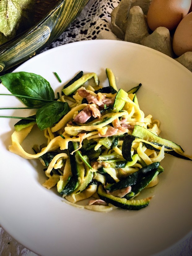 Buona vita, buone tagliatelle in crema di zucchine e lattuga con prosciutto crudo croccante ❤️