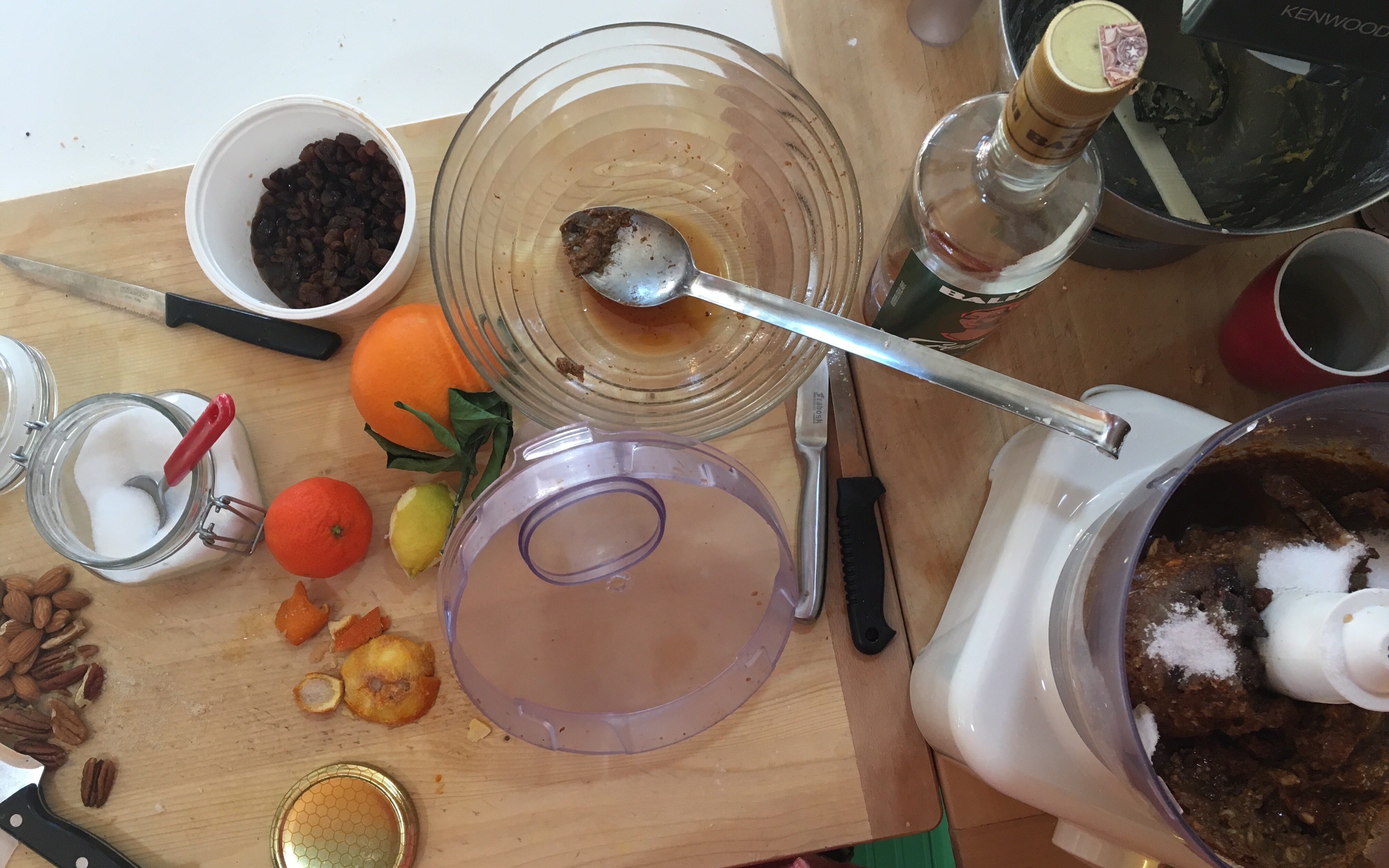Mettere a bagno i fichi secchi lavati e scolati nell’acqua per una notte se sono tanto secchi, qualche ora se ancora sono morbidi. Li scoliamo e li mettiamo a frullare grossolanamente nel robot in questo modo faranno prima a cuocere. Mettiamoli a cuocere con il mosto cotto o la sapa o un vino liquoroso della quantità che serve a ricoprirli. Io l’ho fatto con la pentola a pressione e ci vorranno pochi minuti. Comunque sia, stiamo attenti a non farli attaccare. I fichi devono risultare come un pastone. Uniamo ora tutti gli altri ingredienti le mandorle e le nocciole tritate, le uvette fatte rinvenire nell’acqua calda e scolate e tenute a bagno nel liquore, il caffè, il cioccolato fondente a pezzetti, il cedro candito facoltativo, i filetti di arancia canditi, lo zucchero, la buccia di limone e arancia, le due farine e il pane grattugiato. Mescoliamo per bene e lasciamo riposare per una notte.