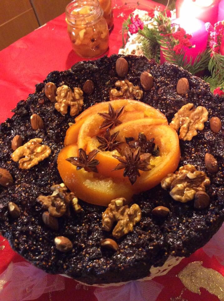 La sera innanzi d’esser mandato al forno, si fanno bollire i fichi, (Kg 1) farina di grano e di granturco, Kg. 0,500 per sorta, mollica di pane bianco gr. 250, mescolare tutto insieme fino a che i fichi non sono ben cotti, da non essere però spappolati. Si mette tutto in un recipiente di coccio o di alluminio. Il giorno appresso, la mattina si aggiunge l’uva in chicchi, gr. 100; noci un chilogrammo (peso delle noci non schiacciate); mandorle un etto schiacciate; altrettanti pinoli; olio cucchiai 4. S’impasta il tutto fino a che non sia ben distribuito tutto il condimento. Se la pasta preparata la sera innanzi alla mattina fosse troppo tosta, allora si ricorrerà alla saba (dolcificante ottenuto dalla bollitura del mosto d’uva) allungata. Fatto tutto questo, si mette in recipiente di rame avente l’orlo alzato e si manda al forno per la cottura. Il forno non sarà troppo caldo, si dovrà infornare subito dopo sfornato il pane.