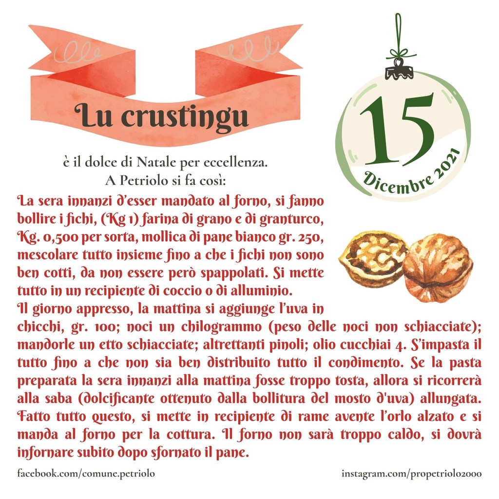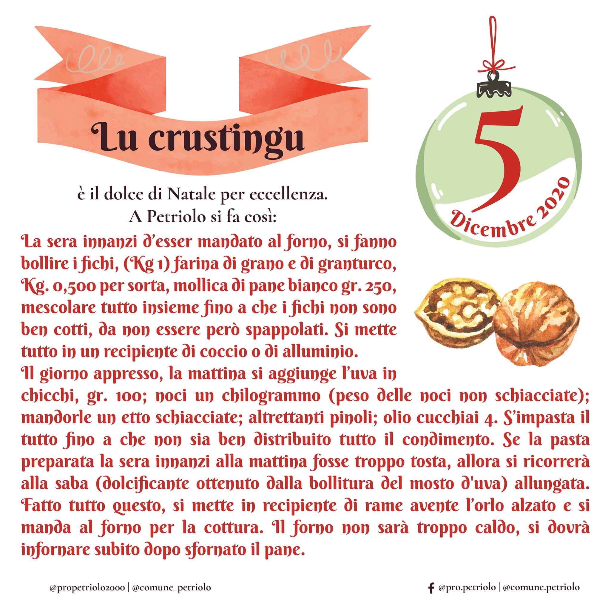 C’è un diario familiare, c’è un tragitto particolare, ci sono gesti ed usi personali per preparare lu crustingu, un dolce popolare di petriolo e dintorni. Ci sono racconti di miseria e di stenti dietro questo particolare dolce perché le massaie di tanto tempo fa, sapevano arrangiarsi con i pochi ingredienti di tutti i giorni. Un “acino” di tutto, così raccontavano, per dire poco di ogni ingrediente a portata di casa, ma la magia era assicurata e sulle loro parche mense, nelle feste comandate qualcosa di dolce e buono arrivava sempre. Per fare lu crustingu a quei tempi, l’ingrediente principale era il pane che non mancava essendo quasi l’unico alimento per poter sfamare le numerose famiglie, si univano la farina di frumento e di mais, le noci, i pinoli, le mandorle perché un albero di mandorlo era piantato in ogni pezzo di terra, i fichi che in campagna si mettevano da parte nel corso della sua stagione, il resto più costoso come lo zucchero, il caffè, il cacao se li potevano sognare, erano alimenti costosi e solo di recente uso. Dopo la fine della guerra le massaie hanno potuto arricchire le loro preparazioni e così anche “lu crustingu”!