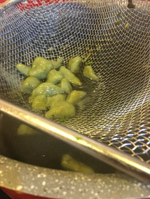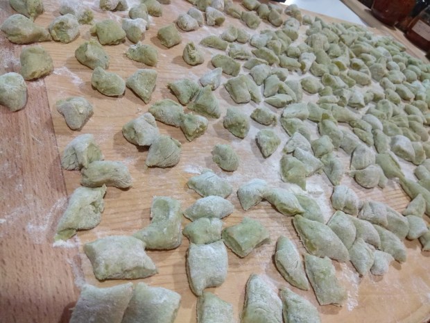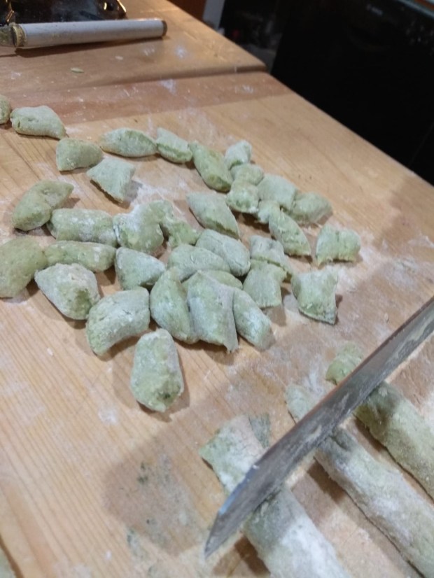 Gnocchi di patate ed ortiche. Pazienza se stamattina abbiamo perso un’ora di sonno, anzi per me ne sono molte di più, ma bisogna preparare per far mangiare una famiglia al completo. Ci sono le ortiche e la rucola raccolte e “capate”ieri da Maurizio, le facciamo sbollentare in acqua bollente salata, le scoliamo, le frulliamo ed intanto facciamo cuocere le patate senza buccia e tagliate a pezzi nella pentola a pressione con un filo di acqua. Le scoliamo per bene lasciandone alcune nella stessa acqua di cottura. Passiamo le patate al passaverdura, mai frullate perché diventerebbe colla, le lasciamo cadere sulla spianatoia uniamo le ortiche frullate e con la farina in parte integrale ed in parte 0, impastiamo per formare dei rotolini che taglieremo a pezzetti di due o tre centimetri. Per il condimento, schiacciamo con la forchetta le restanti patate rimaste nella pentola con la loro acqua, le mettiamo nella padella con olio extravergine d’oliva, uniamo le ortiche e la rucola frullate, uniamo un po’ dell’acqua calda della cottura degli gnocchi, il rosmarino battuto, se ci piace, la ricotta o un altro formaggio cremoso, ed il parmigiano reggiano. Scoliamo gli gnocchi e li facciamo saltare nella crema di ortiche e rucola. Mescoliamo e serviamo. Troppo lunga la preparazione? No, basta avere la pazienza e detto da me che non ne ho, si può fare questo piatto. Ora o mai più! Oggi è più dura!
