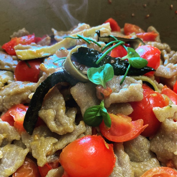 I maltagliati mischi, cotti nell’acqua delle bietole, sono stati ripassati in padella con le zucchine grigliate, i pomodorini che hanno cotto solo pochi minuti, per non perdere il sapore e le vitamine, olio extravergine di oliva e parmigiano insieme alle erbe aromatiche. Santoreggia, timo, maggiorana, erba cipollina è una fogliolina di menta glaciale!