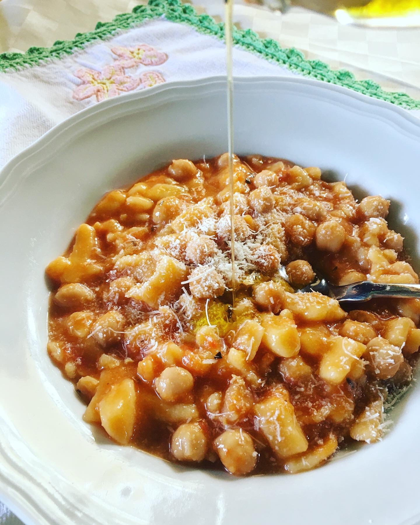 Una specie di quadrucci all’uovo fatti però solo di farina di grano tenero ed di granoturco impastati con acqua e un pizzico di sale. Si faceva la “perna”, la si lasciava asciugare sopra “la spianatóra”, o sopra il letto, la si arrotolava e la si tagliava grossolanamente lasciandola appiccicare. Si preparava un sugo di pomodoro e cipolla profumato di rosmarino e di univano i ceci, acqua calda o brodo e si calavano i “ quatrúcci mischi”! Mischi per misti. Un filo di olio extravergine di oliva ed una spolverata di parmigiano reggiano, quest’ultimo sono in tempi di benessere!