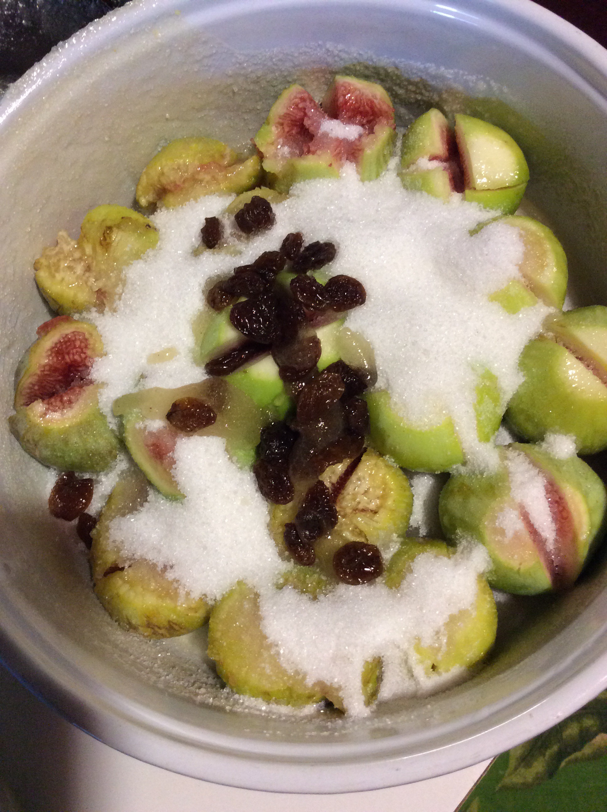 In una terrina sistemare i fichi, le uvette, alternando con lo zucchero e il miele, la stecca di vaniglia aperta, il succo di limone e se vi piace, anche un po’ di buccia sopra. Fate riposare per una notte in frigo