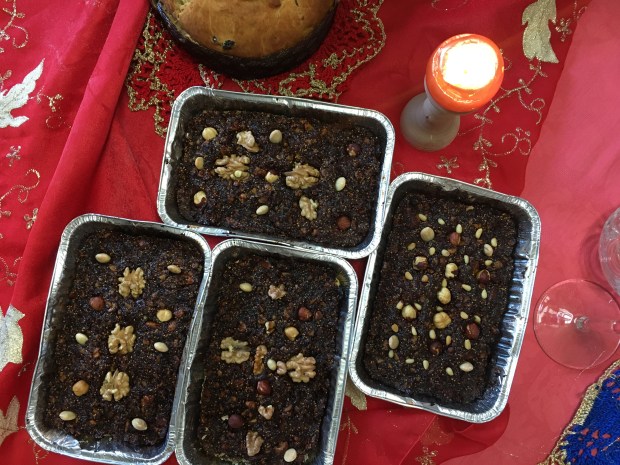 La sera innanzi dโesser mandato al forno, si fanno bollire i fichi, (Kg 1) farina di grano e di granturco, Kg. 0,500 per sorta, mollica di pane bianco gr. 250, mescolare tutto insieme fino a che i fichi non sono ben cotti, da non essere perรฒ spappolati. Si mette tutto in un recipiente di coccio o di alluminio. Il giorno appresso, la mattina si aggiunge lโuva in chicchi, gr. 100; noci un chilogrammo (peso delle noci non schiacciate); mandorle un etto schiacciate; altrettanti pinoli; olio cucchiai 4. Sโimpasta il tutto fino a che non sia ben distribuito tutto il condimento. Se la pasta preparata la sera innanzi alla mattina fosse troppo tosta, allora si ricorrerร alla saba (dolcificante ottenuto dalla bollitura del mosto d’uva) allungata. Fatto tutto questo, si mette in recipiente di rame avente lโorlo alzato e si manda al forno per la cottura. Il forno non sarร troppo caldo, si dovrร infornare subito dopo sfornato il pane.