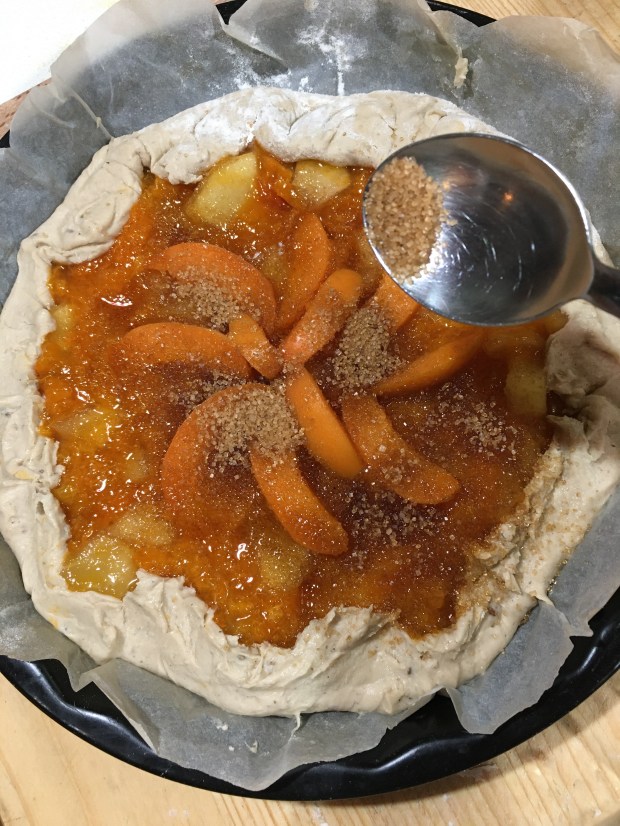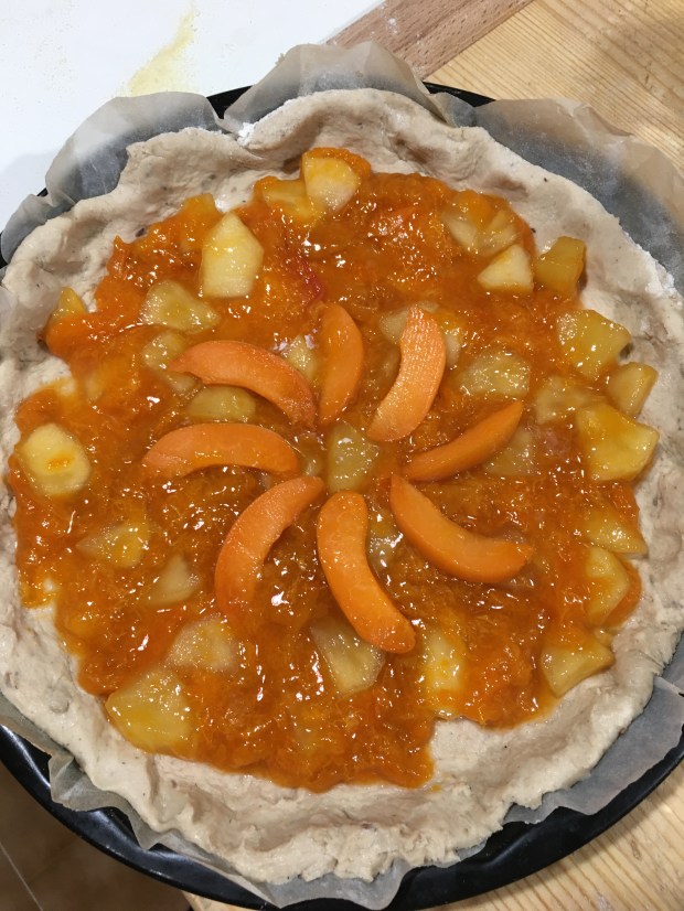 Apriamo a metà le albicocche, quattro le teniamo da parte, le altre le mettiamo a cuocere insieme alla mela a pezzetti, con metà dello zucchero e poca acqua nel forno a microonde o in un pentolino, uniamo la vaniglia o la cannella o la menta. Lavoriamo la farina con il lievito ed il burro a temperatura, uniamo lo zucchero di canna, il latte quanto ne serve per ottenere un impasto morbido. Stendiamo la pasta sopra uno stampo di 24 centimetri foderato di carta forno, mettiamo sopra un po’ di mandorle e le albicocche cotte in purea, ripieghiamo i bordi, decoriamo con le quattro albicocche tenute da parte, spennelliamo con un uovo tutto il cerchio e spargiamo di mandorle. Mettiamo a cuocere a 200 gradi per 30/35 minuti. Regoliamoci toccando il bordo che essere croccante ed asciutto.