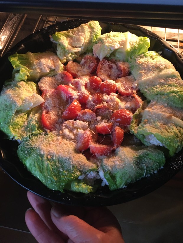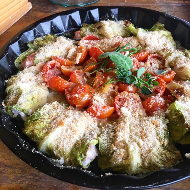 Mettiamo un po’ del ripieno sopra ogni foglia di lattuga, la chiudiamo ad involtino partendo dalla parte più fina, quella dove è attaccata ogni foglia e sistemiamo a raggiera tutti gli involtini sopra ad una teglia antiaderente con un filo di olio extravergine di oliva, riempiamo il centro vuoto della teglia con pomodorini tagliati salati e cospargiamo prima il parmigiano reggiano e poi pane grattugiato con erbe aromatiche. Mettiamo in forno a 180 gradi per 30 minuti.