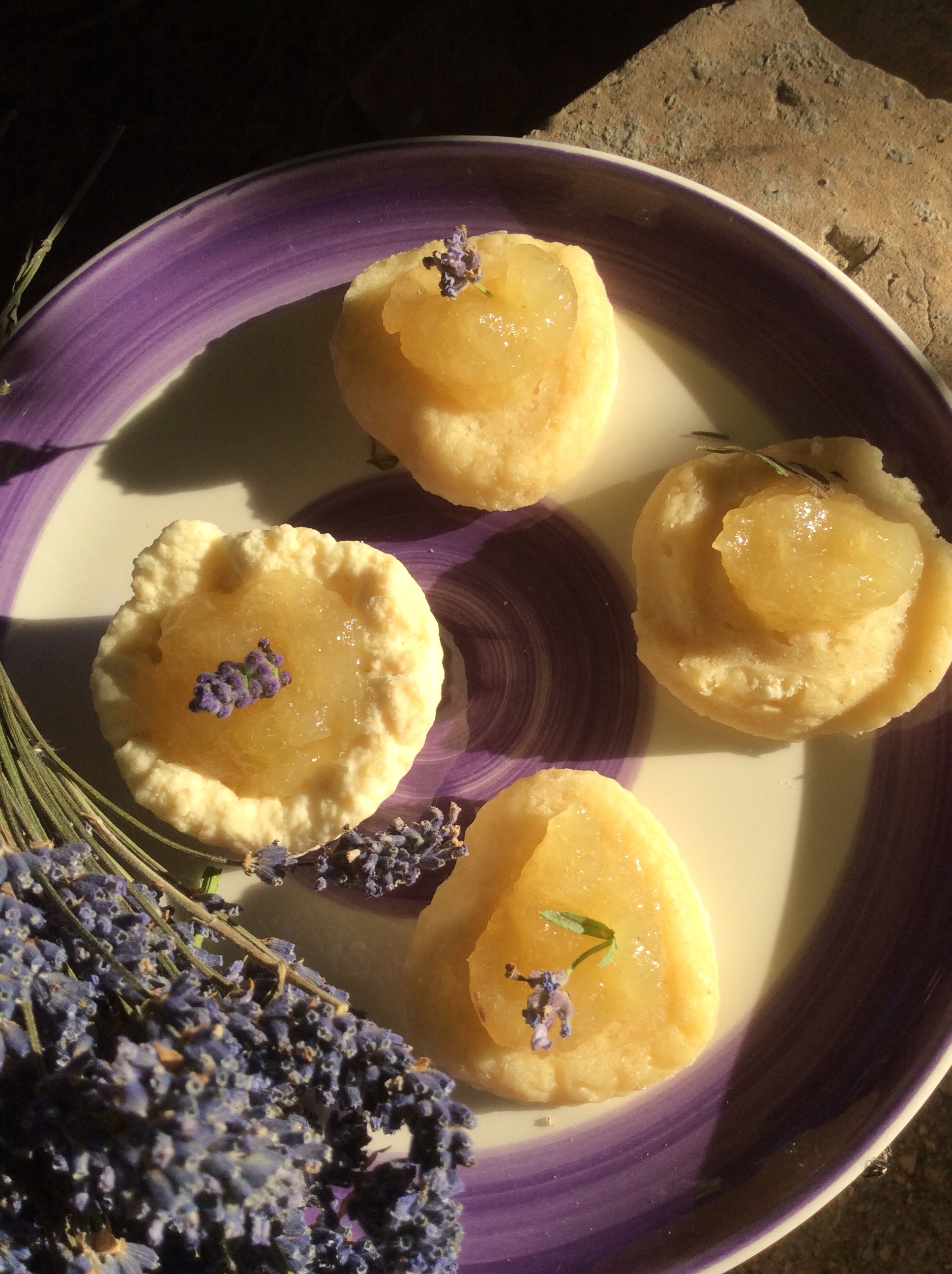 Lavorare la farina con il burro, la lavanda in gocce o fiori e foglie, un cucchiaio di zucchero di canna e il sale. Fare un impasto morbido e lasciarlo riposare coperto con un piatto per circa un’ora.