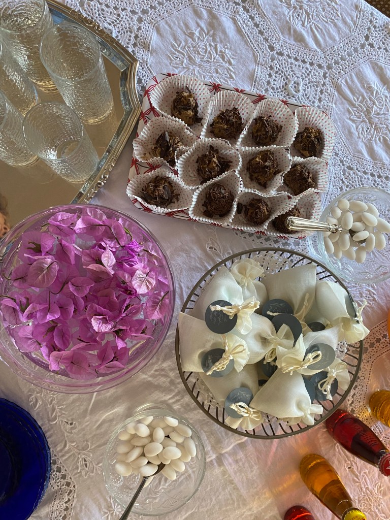 Sopra al tavolo della sala, ci sono i succhi di frutta, qualche crodino, due ciotoline con i confetti classici alla mandorla ed il cucchiaino di argento, i tartufini fatti a modo mio e la cheesecake stracciatella, i piattini blu e le forchettine da dolce, i fiori della boungavillea immersi nell’acqua in una ciotola trasparente!