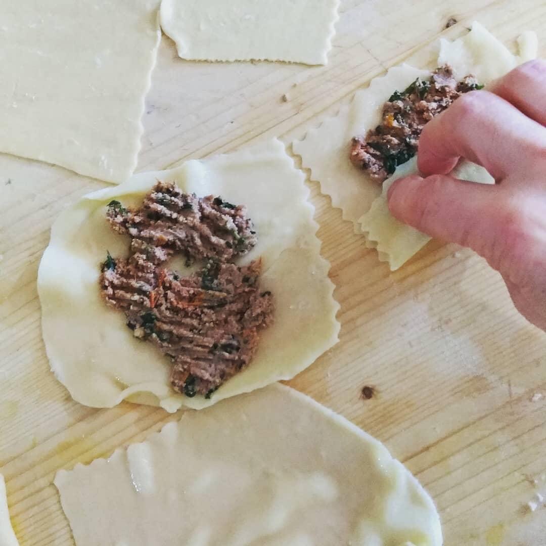 Ho steso la pasta, l’ho tagliata per fare i ravioli che ho farcito con la ricotta e gli altri ingredienti.