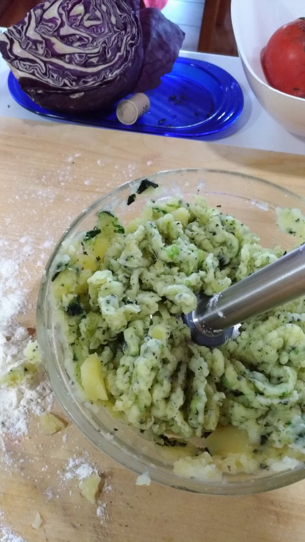 Ho la ricotta comprata ieri, taglio le coste più belle delle bietole che userò domani per delle lasagne vegetariane, metto a bollire le foglie verdi e grandi insieme ai finocchi con tutti i ciuffi. Una volta cotte le faccio scolare per bene strizzandole per togliere tutta l’acqua e appena fredde le frullo. Prendo la ricotta, scolata anch’essa, metto il sale, la noce moscata, la buccia di limone, le bietole ed i finocchi con i loro ciuffi frullati, un paio di uova, parmigiano reggiano e pecorino. Mescolo per amalgamare bene e lascio da parte.