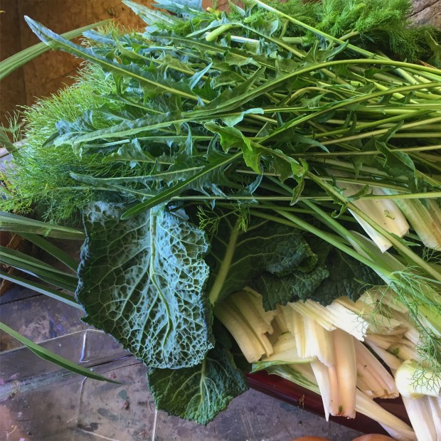 Cavoli neri e viola, sedani, fiori di rape, cicoria che arriva a toccare il cielo e bietole con le coste carnose ed ancora ciuffi di finocchi diventati coriacei!