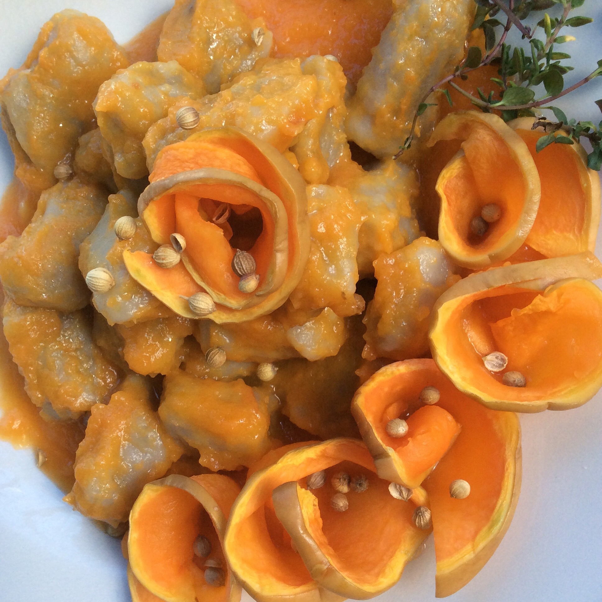 In un piatto da portata versare un po’ di crema di zucca, gli gnocchi già spadellati, alcuni semi di coriandolo, le foglioline di maggiorana ed un filo di olio extra vergine. Guarnire il piatto con le fettine di zucca croccanti arrotolandole a forma di rosellina. Servire ben caldo.