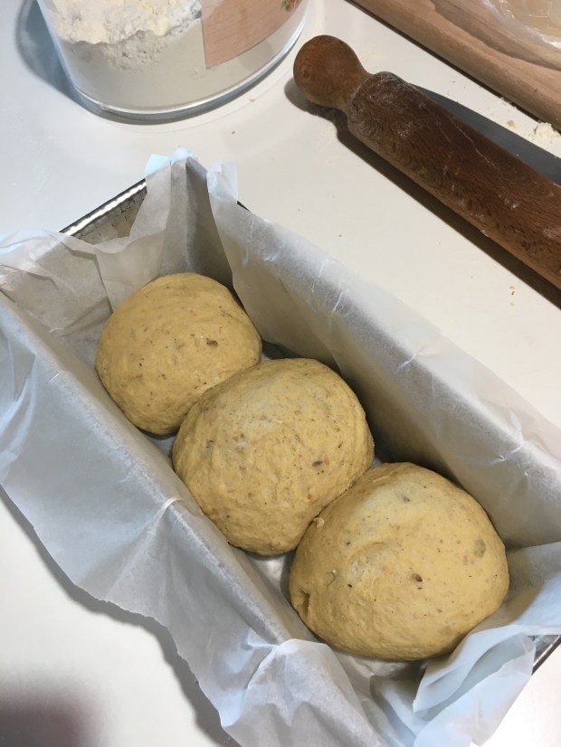 Ho steso un cilindro, ho tagliato 4 palline, che ancora una volta ho sgonfiato e fatto lievitare un po’, ho sgonfiato ancora e formato 4 palline che ho sistemato in uno stampo a cassetta. Ho lasciato raddoppiare fino a quando la pasta è arrivata al bordo dello stampo. Ho cotto a 200 gradi abbassando a 180 ogni dieci minuti, fino a150:160 gradi per un totale di tre quarti d’ora. Ho coperto con un foglio di alluminio a metà cottura.