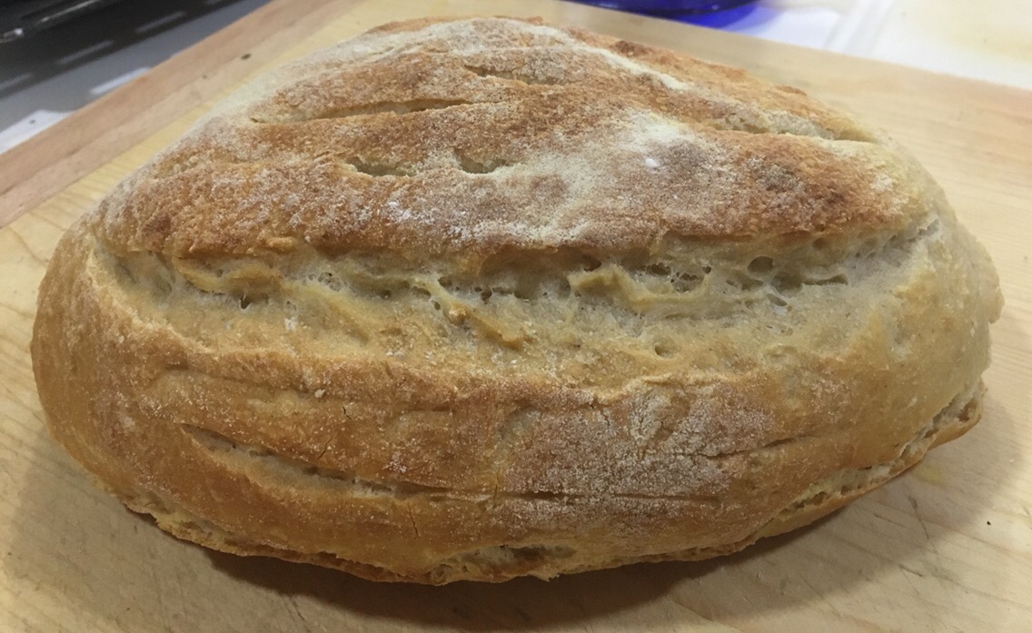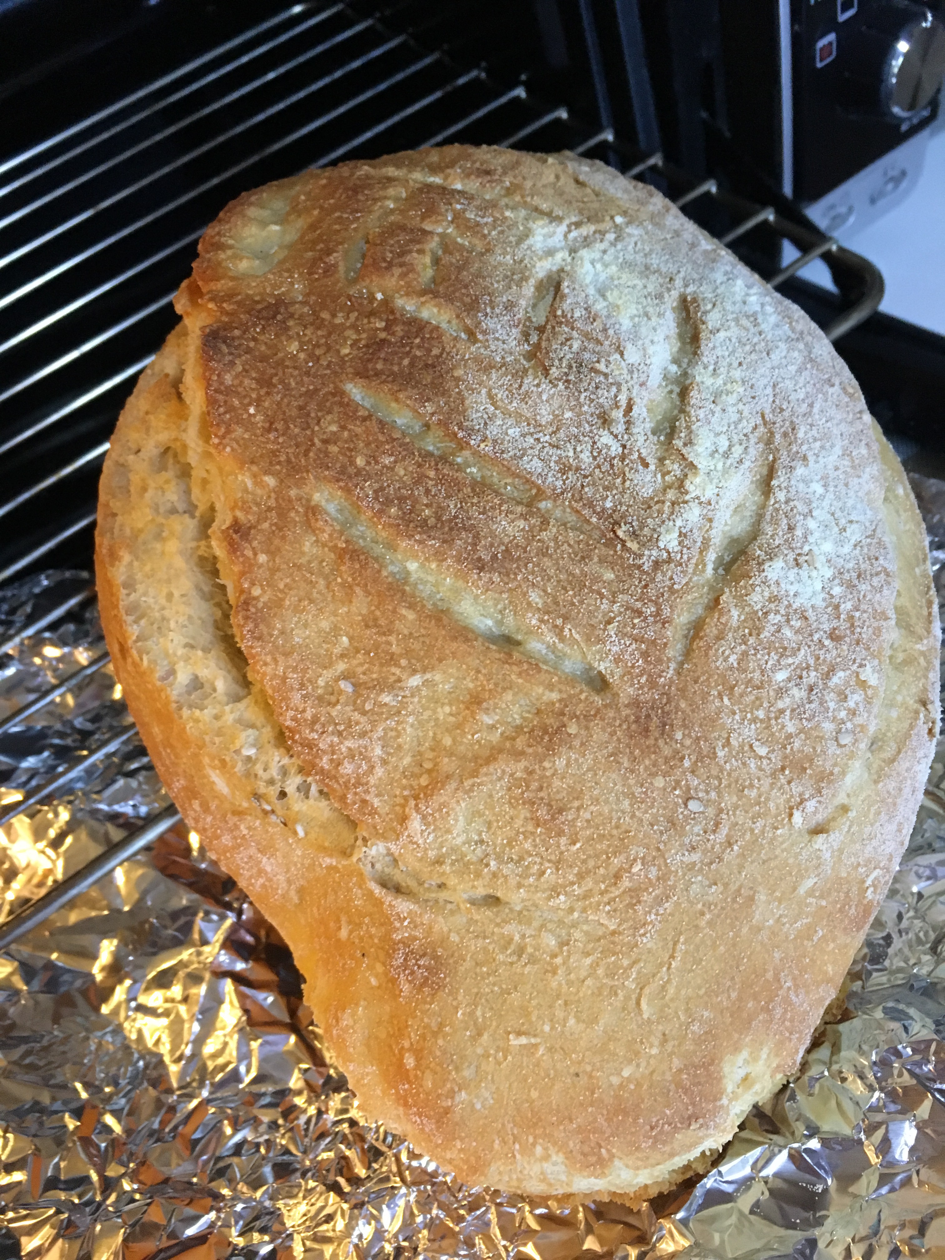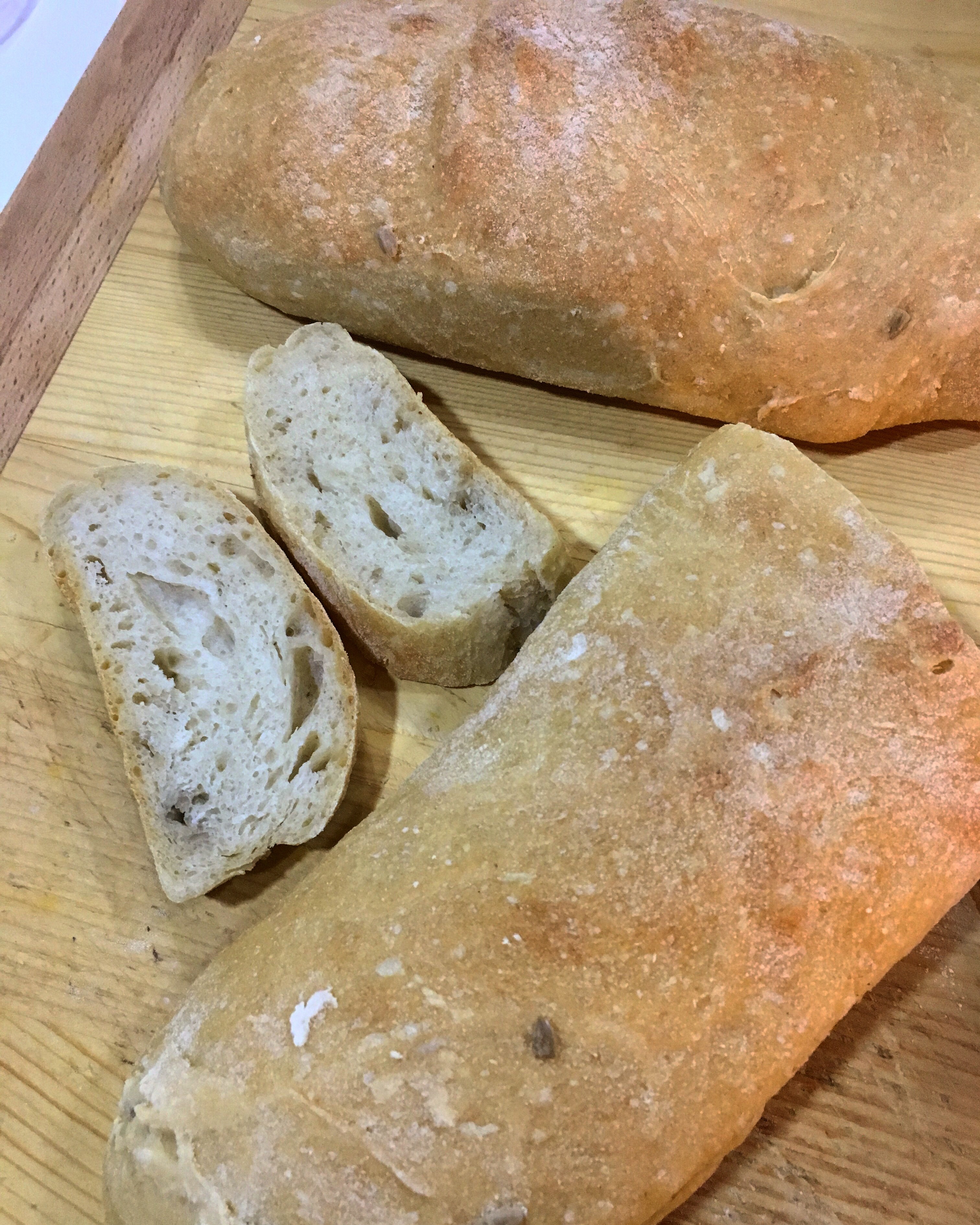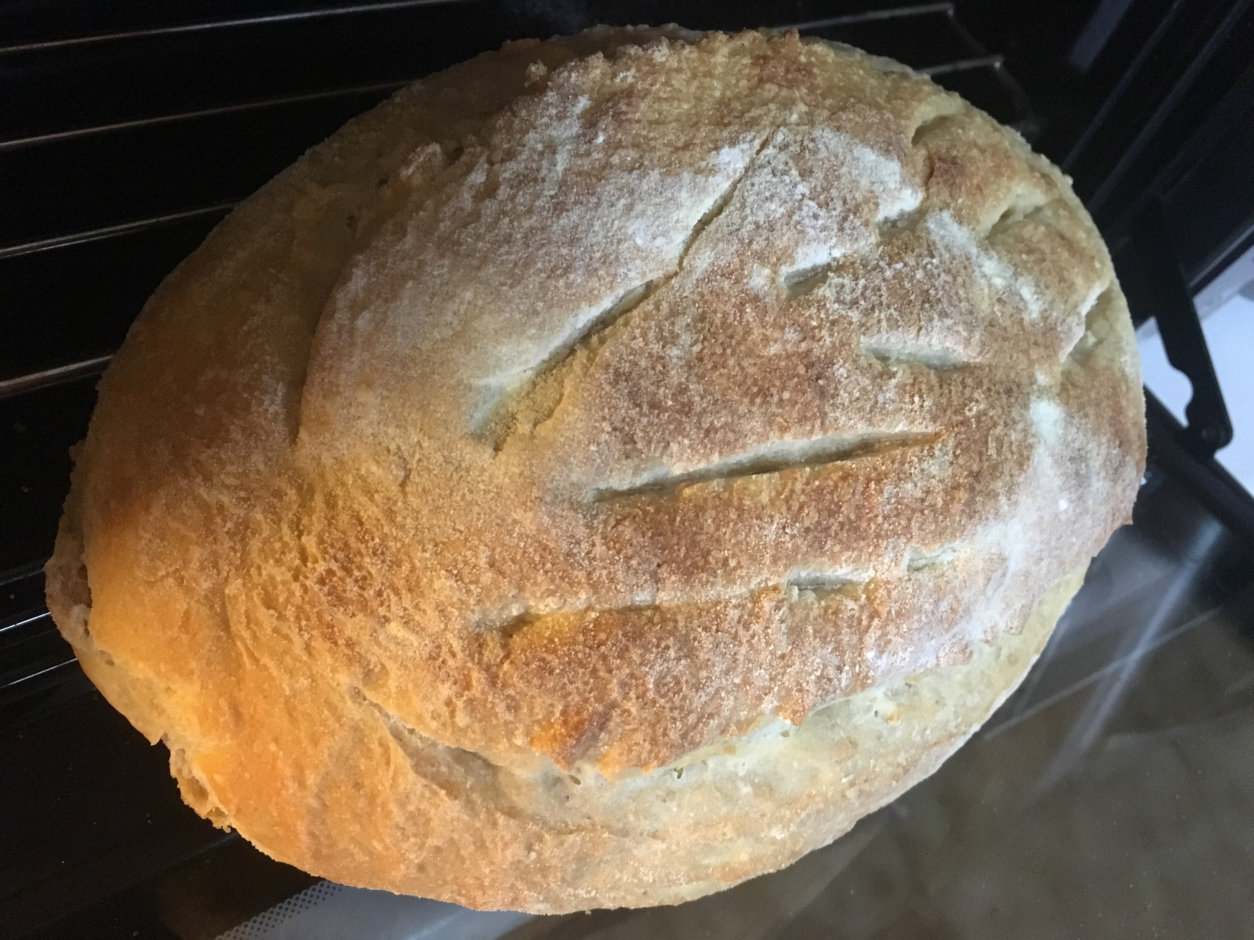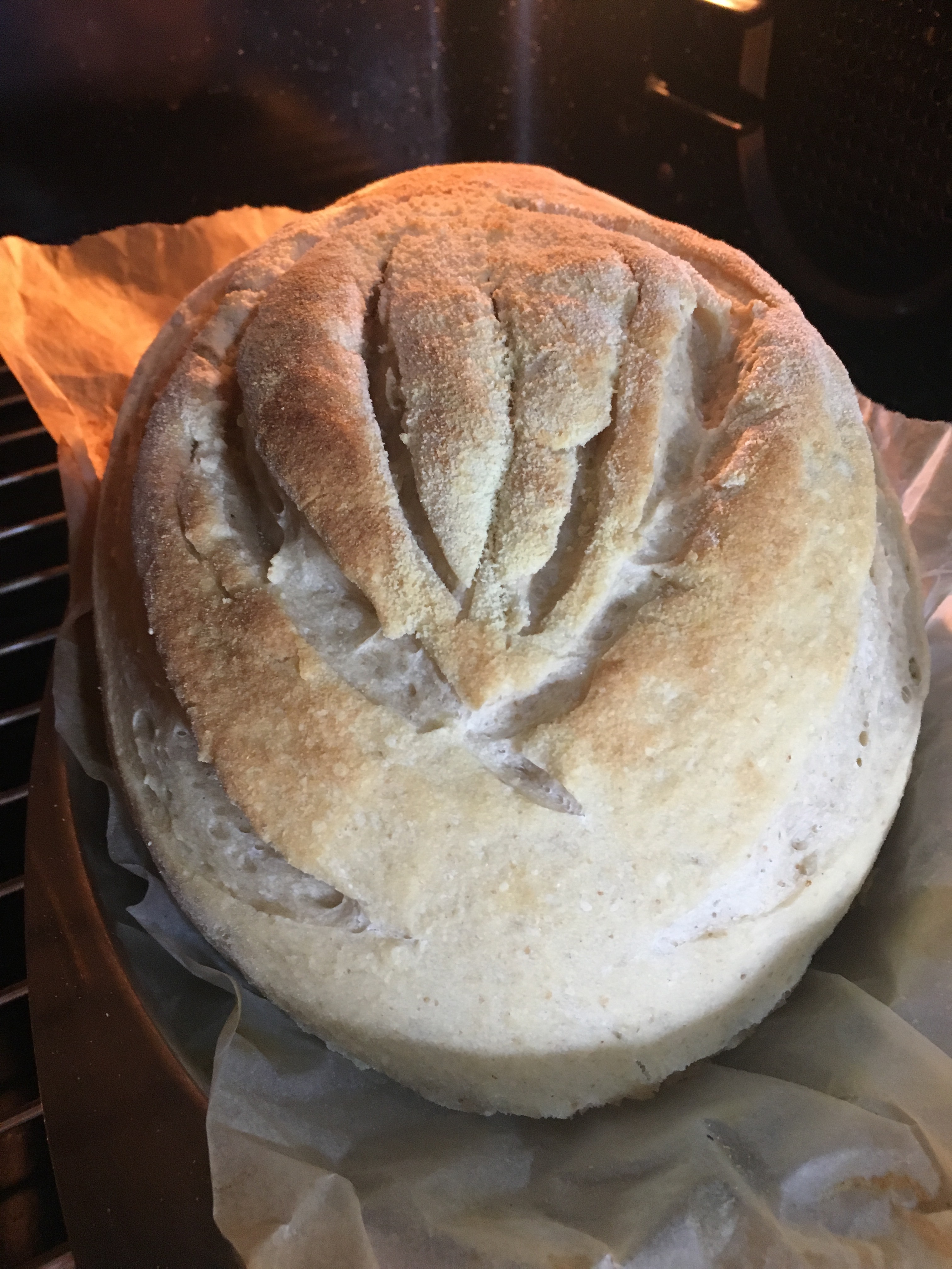 Questo pane come quasi tutto il nostro pane che facciamo, ha una lievitazione lunga, che può variare da una notte ad una notte e mezza giornata o di due giorni a seconda di come voglio che si faccia la cottura è senza impasto perché basta sciogliere il lievito madre o di birra nell’acqua con un cucchiaino di malto d’oro o di miele, aggiungere la faina ed il sale mescolare con un cucchiaio e mettere a lievitare al fresco fino al raddoppio! Una volta lievitato, si lascia cadere sopra al tavolo infarinato, si fa una piega una o due volte, si mette nel cestino a fare l’ultima lievitazione. Si mette a cuocere in forno caldo per un’ora.