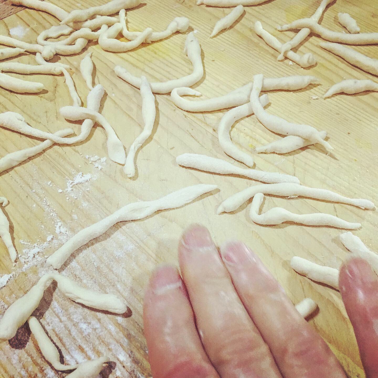 Dopo i ricordi, oggi descriviamo invece le nostre pinciarelle o pingiarelle. Molto spesso le prepariamo con l’esubero di pasta madre ed acqua, ci piace variare le farine come quella di castagne, di farro o di grano saraceno, spesso con le uova se vogliamo un primo completo e sostanzioso o senza acqua se poi facciamo seguire un secondo piatto.
