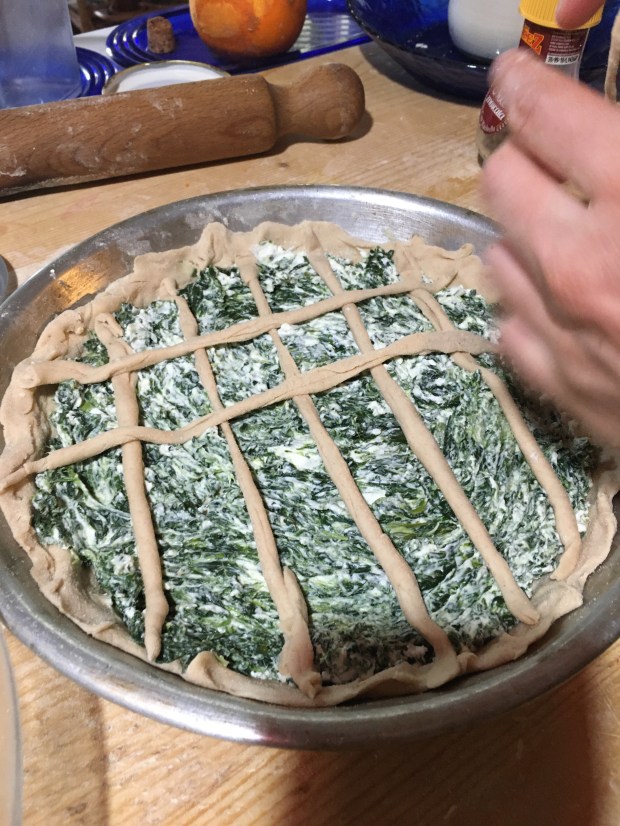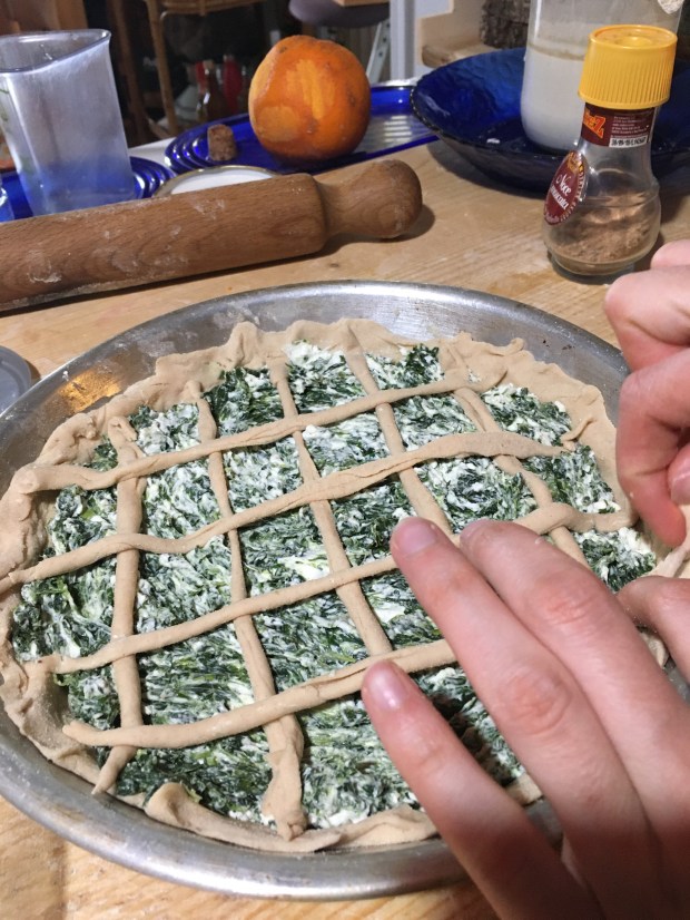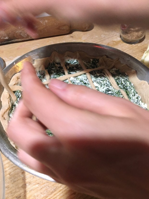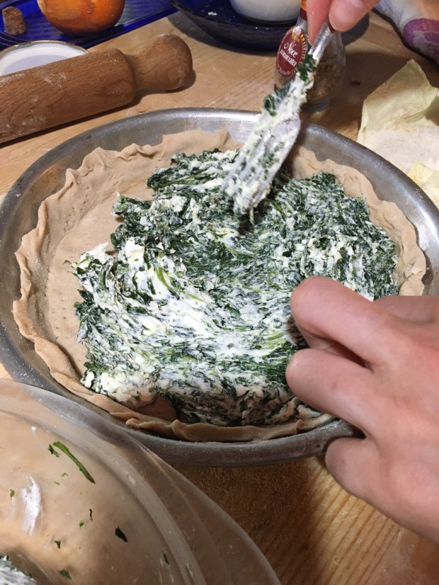 Per la torta salata, abbiamo steso un pezzo della pasta avanzata, bucato con la forchetta, steso sopra gli spinaci surgelati passati in padella con olio extravergine di oliva con l’aggiunta di Filadelfia parmigiano reggiano e noce moscata. Abbiamo cotto a 160 gradi per una ventina di minuti.