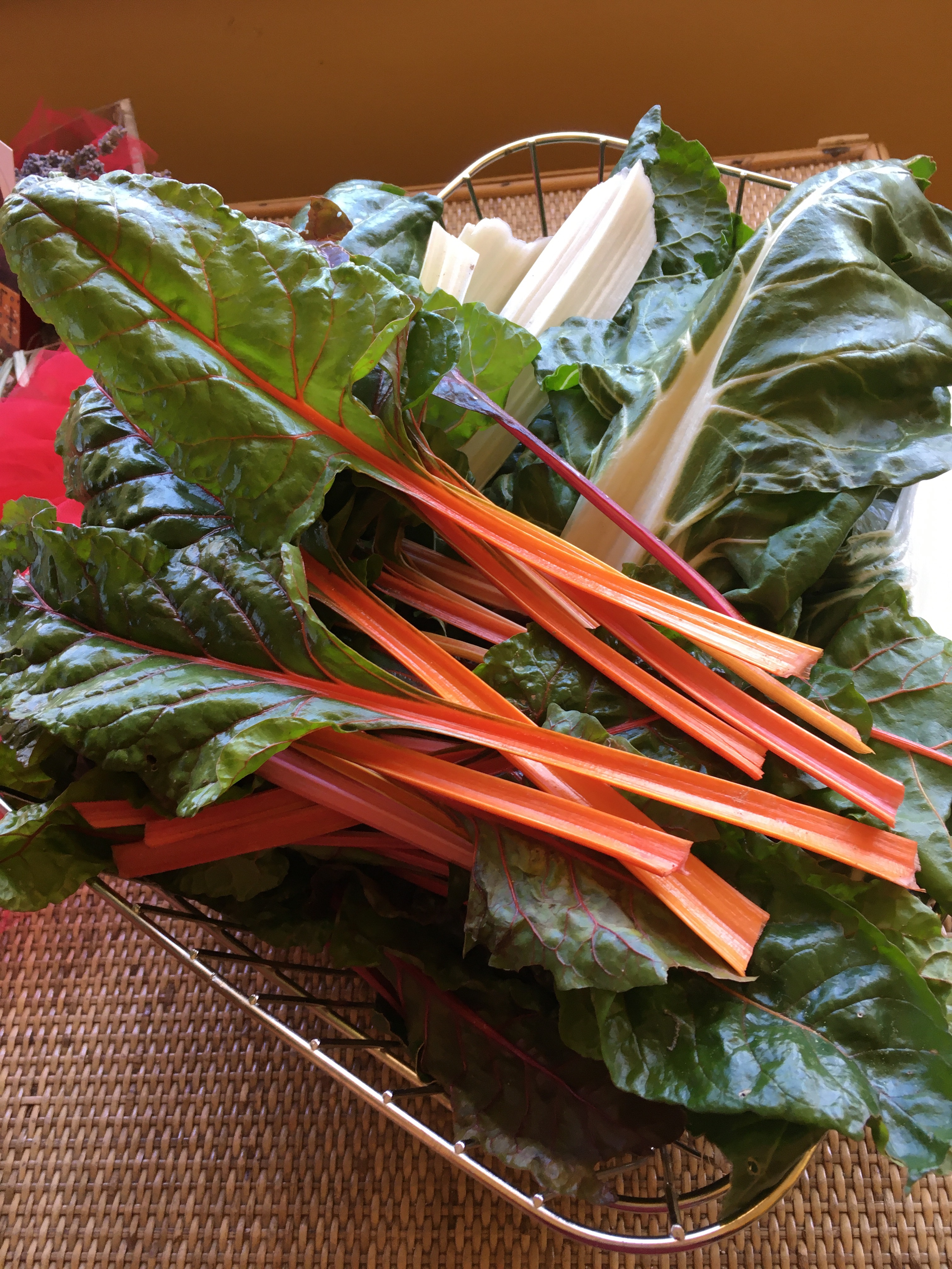 Finalmente un po’ di verdura fresca appena raccolta nel nostro ormai scarno orto frutteto, bietole rosse e verdi, due asparagi selvatici che stanno sotto e non compaiono nella foto.