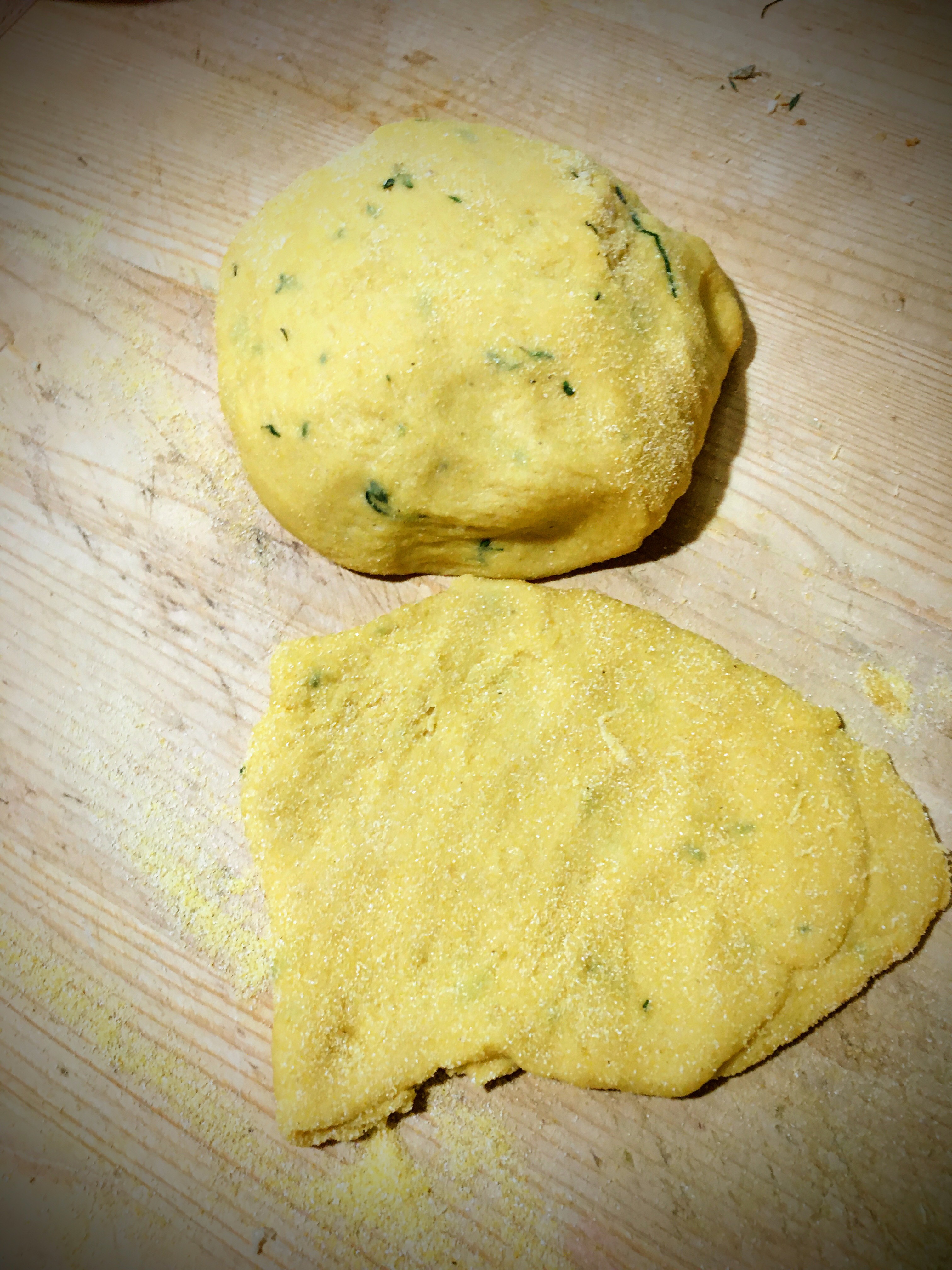 La pasta rustica l’abbiamo impastata nella ciotola della planetaria, possiamo farla anche sopra la spianatoia, mettendo due uova, farina di mais e di tipo 0, un pizzico di sale ed erbe aromatiche come timo, erba cipollina ed un po’ di mentuccia ed acqua quanta ne serve per ottenere un impasto tipo le tagliatelle. Una volta impastato il tutto, l’abbiamo finita di lavorare a mano facendola riposare coperta da una ciotola.